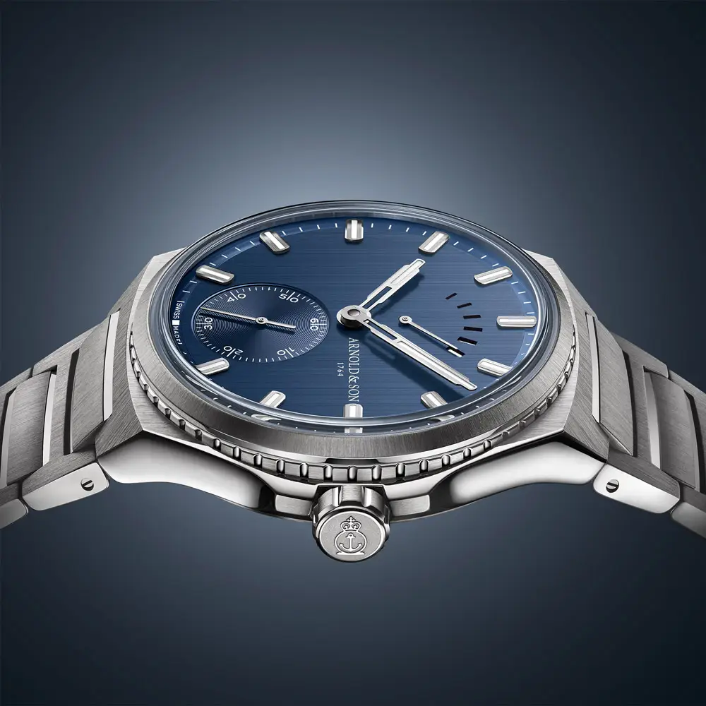 Mẫu đồng hồ Arnold & Son Longitude Titanium là sự kết hợp hoàn hảo giữa cảm hứng hàng hải, độ chính xác kỹ thuật và phong cách hiện đại. Vỏ đồng hồ 42,5 mm được chế tác từ titan siêu nhẹ, bền bỉ; mặt số xanh biển chải dọc với các cọc số phát quang gợi liên tưởng đến đại dương sâu thẳm. Vành bezel khía tinh tế tôn vinh di sản chronometer hàng hải của thương hiệu.