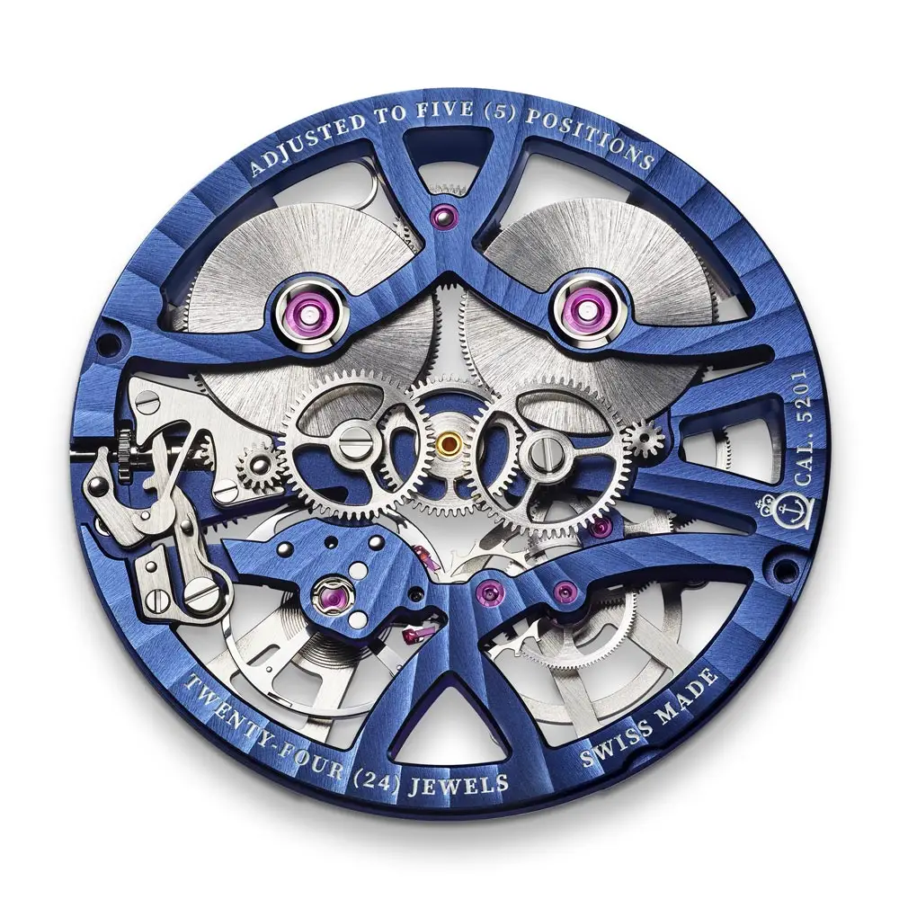 Bộ máy A&S 5201 lên cót tay, dự trữ năng lượng 90 giờ, trang trí bằng cầu nối phủ PVD xanh và chi tiết mạ rhodium tạo độ sâu và tương phản. Hiển thị giờ, phút và kim giây nhỏ tại vị trí 7 giờ, thể hiện sự cân đối hoàn hảo – dấu ấn của Arnold & Son.