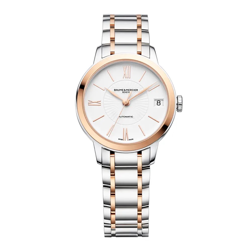 Baume & Mercier Classima M0A10269 là biểu tượng của sự thanh lịch vượt thời gian và nét nữ tính tinh tế. Vỏ thép không gỉ 31 mm kết hợp vành bezel vàng hồng 18K, tạo nên vẻ tương phản hai tông sang trọng. Mặt số màu trắng họa tiết guilloché với chữ số La Mã màu vàng thể hiện tinh thần cổ điển của dòng Classima, trong khi lịch ngày ở vị trí 3 giờ tăng tính tiện dụng.