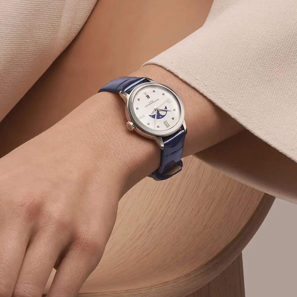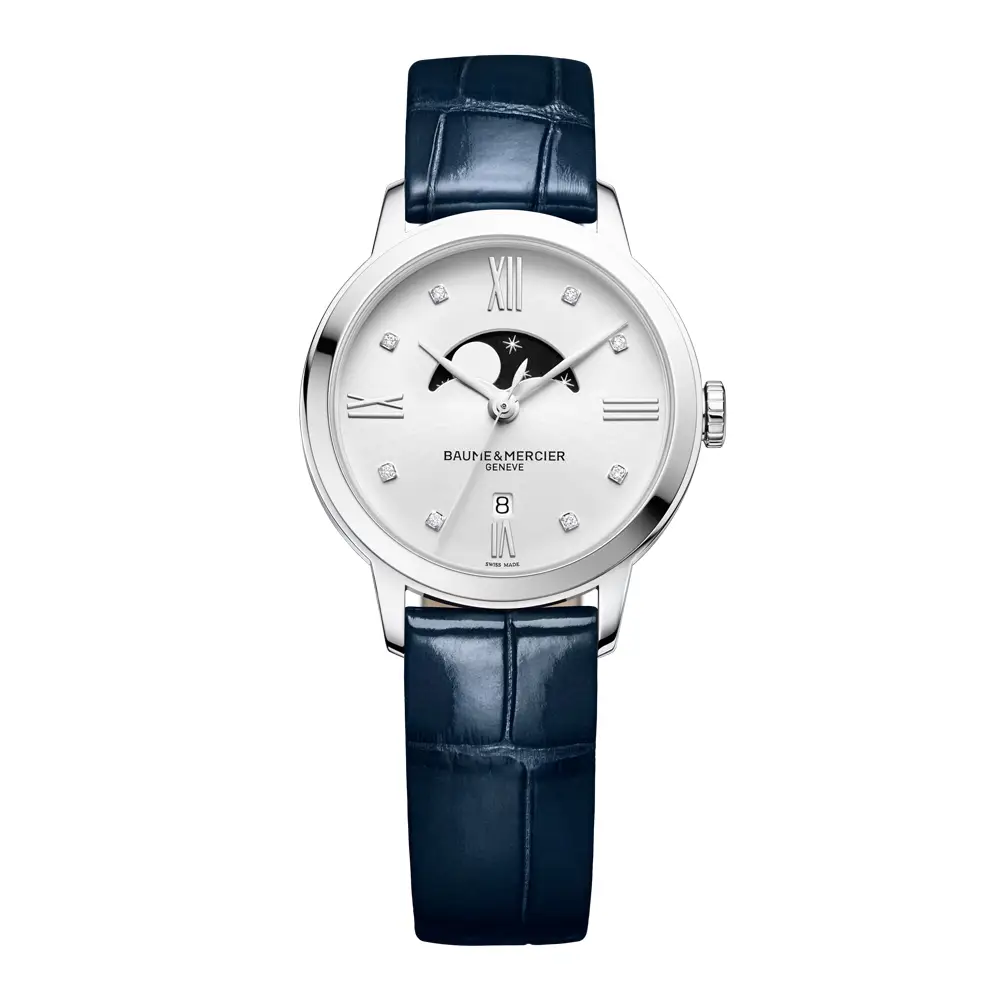 Baume & Mercier Classima M0A10329 là hiện thân của vẻ đẹp nữ tính và nghệ thuật chế tác đồng hồ truyền thống Thụy Sĩ. Vỏ thép không gỉ 31 mm bao quanh mặt số màu bạc đính tám viên kim cương và chữ số La Mã, tạo nên vẻ tinh tế và sang trọng. Ở vị trí 6 giờ là lịch tuần trăng và lịch ngày, mang đến nét cổ điển đặc trưng.