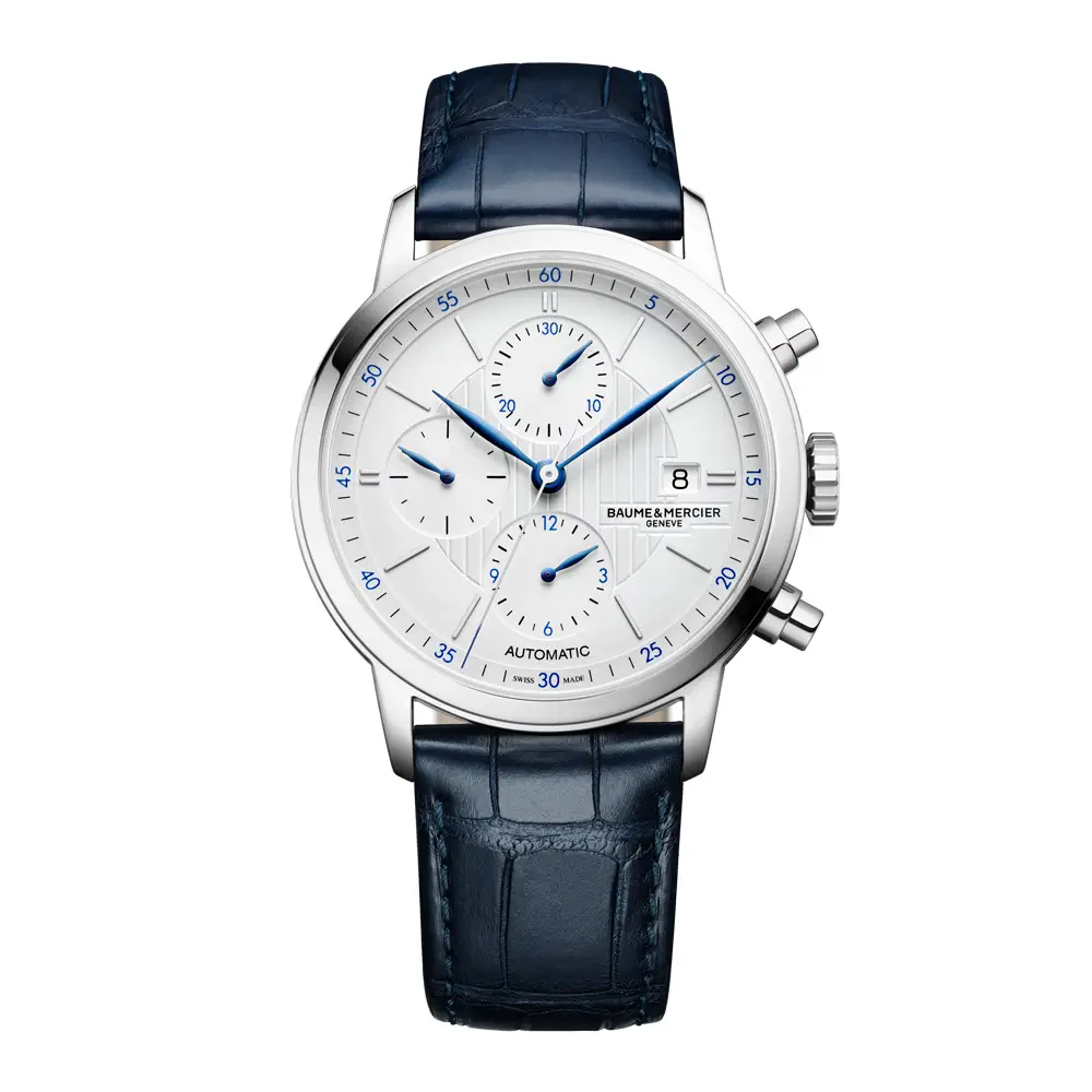 Baume & Mercier Classima M0A10330 kết hợp sự thanh lịch cổ điển với độ chính xác kỹ thuật của nghệ thuật chế tác đồng hồ Thụy Sĩ. Vỏ thép không gỉ đánh bóng 42 mm bao quanh mặt số bạc khắc guilloché với ba mặt phụ và kim màu xanh hình lá, tạo nên phong cách tinh tế và cân đối. Dây da cá sấu màu xanh tôn lên vẻ sang trọng và hiện đại.