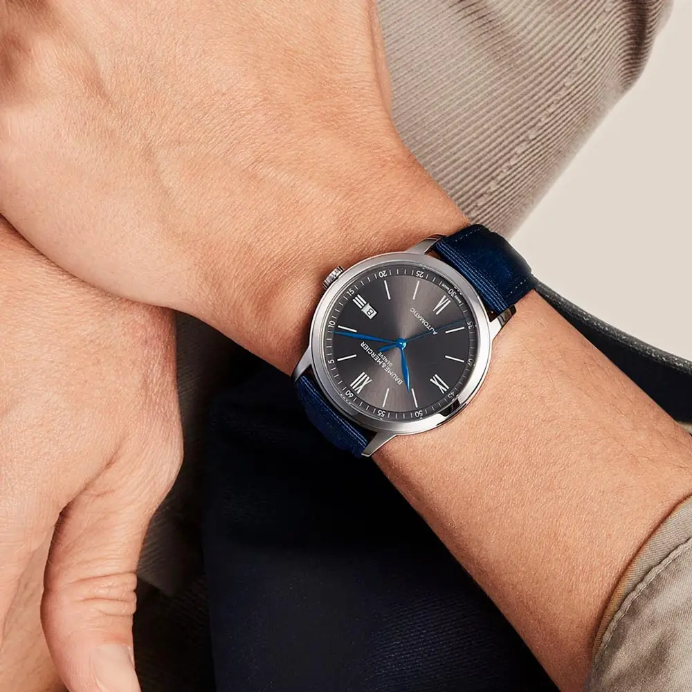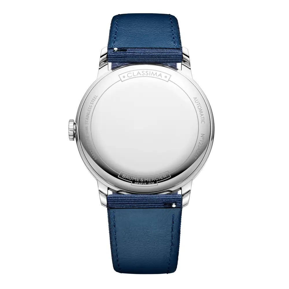 Baume & Mercier Classima M0A10608 mang đến phong cách thanh lịch cổ điển trong diện mạo hiện đại, nhẹ nhàng và tinh tế. Vỏ thép không gỉ đánh bóng 42 mm bao quanh mặt số xám bạc hoàn thiện sun-satin với kim màu xanh, tạo nên vẻ tương phản sang trọng. Dây vải xanh mang đến nét trẻ trung nhưng vẫn đầy tinh tế.