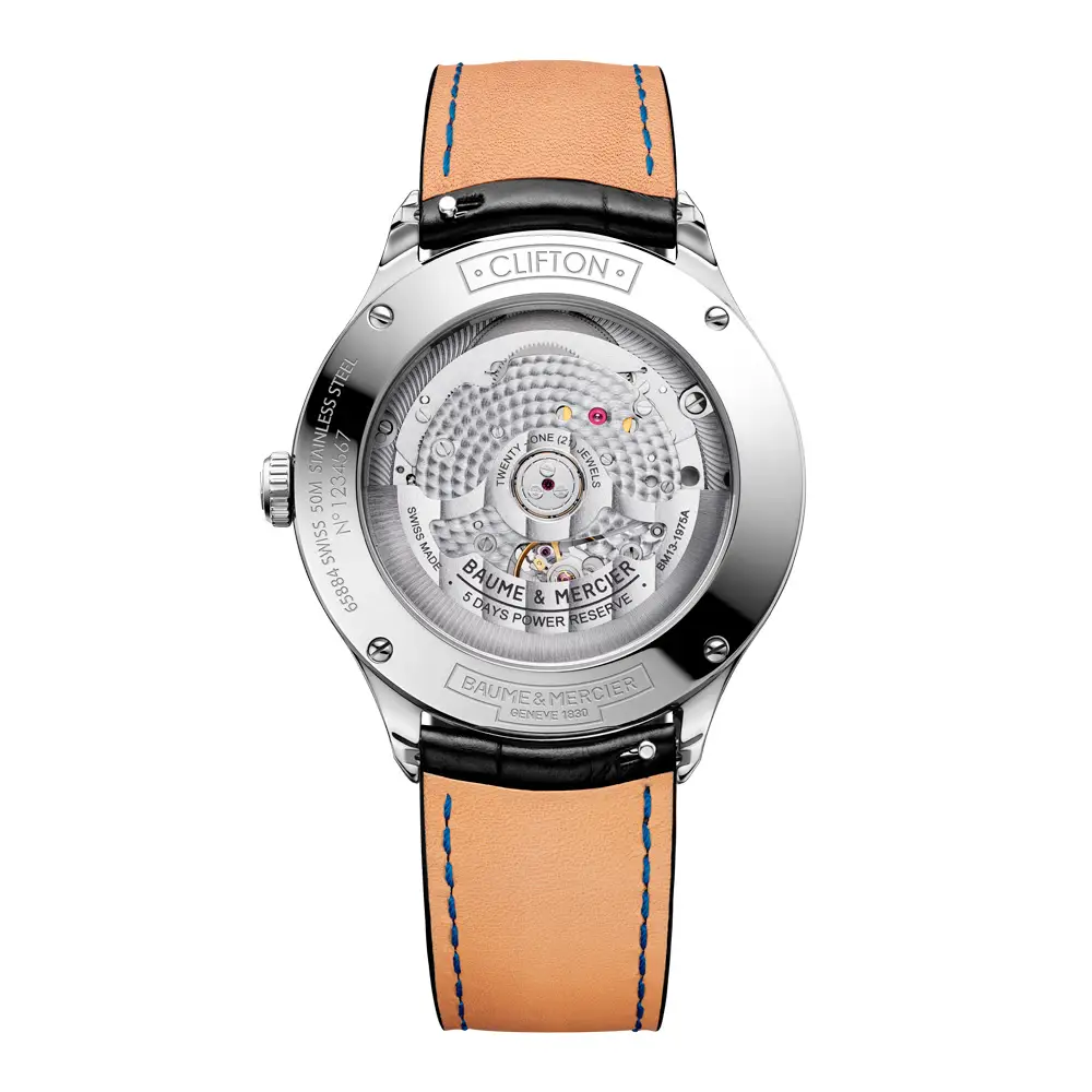 Bên trong là bộ máy tự động Baumatic BM13-1975A, được chứng nhận COSC Chronometer, có dự trữ năng lượng 120 giờ (5 ngày) và độ chính xác vượt trội. Clifton M0A10592 thể hiện độ chính xác Thụy Sĩ, phong cách hiện đại và nét lịch lãm tinh tế của quý ông.