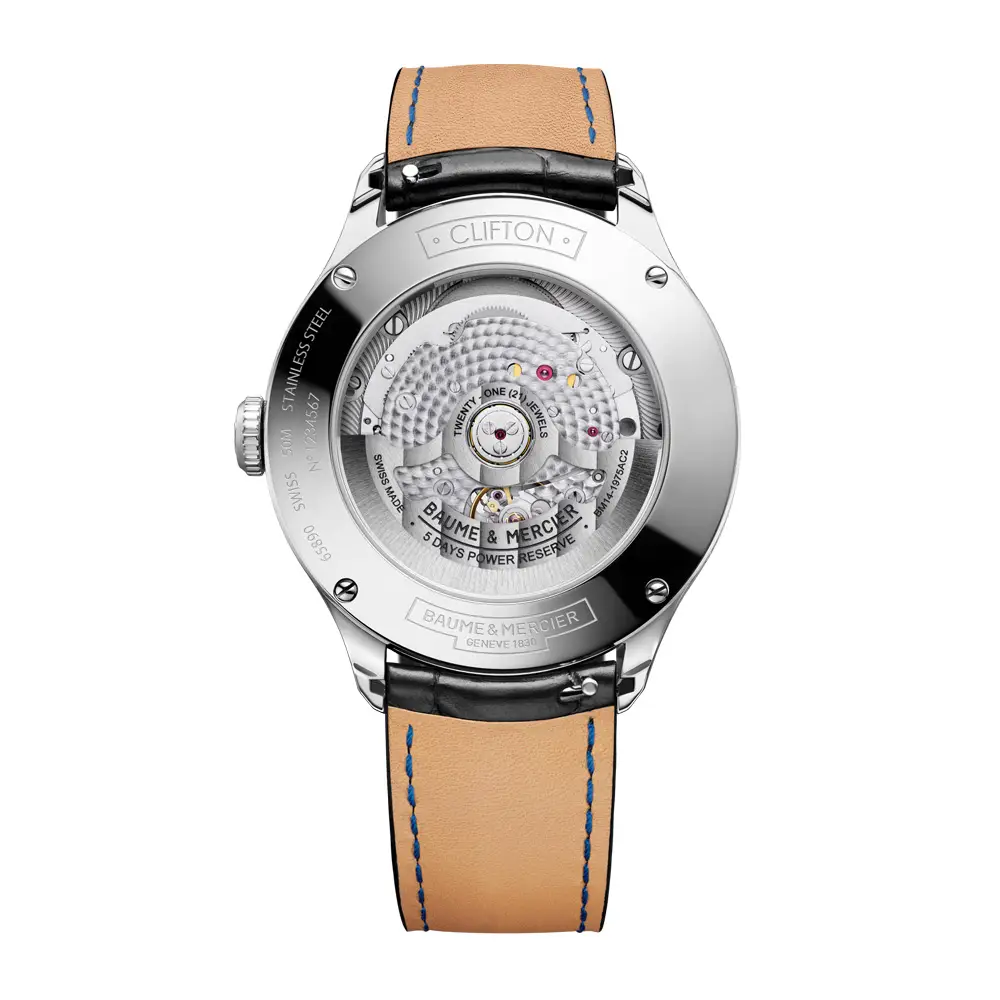 Bên trong là bộ máy tự động Baumatic BM14-1975A C2, với dự trữ năng lượng 120 giờ (5 ngày) và độ chính xác cao đạt tiêu chuẩn Thụy Sĩ. Clifton Baumatic M0A10593 thể hiện sự tinh tế kỹ thuật, thiết kế thanh lịch và đẳng cấp xa xỉ hiện đại của Thụy Sĩ.