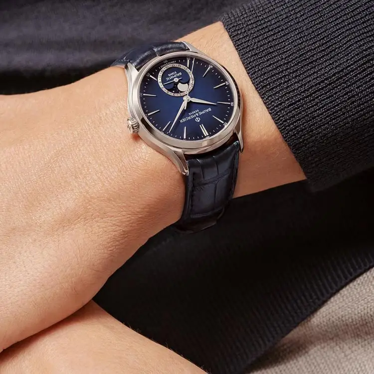 Vỏ thép không gỉ tròn 39 mm thanh lịch, ôm vừa vặn cổ tay. Kính sapphire bảo vệ mặt số analog màu xanh lam nổi bật, vừa rõ ràng vừa tinh tế. Thiết kế hài hòa được bổ sung bởi lịch ngày tiện dụng và chức năng lịch tuần trăng, mang đến nét lãng mạn và sang trọng.