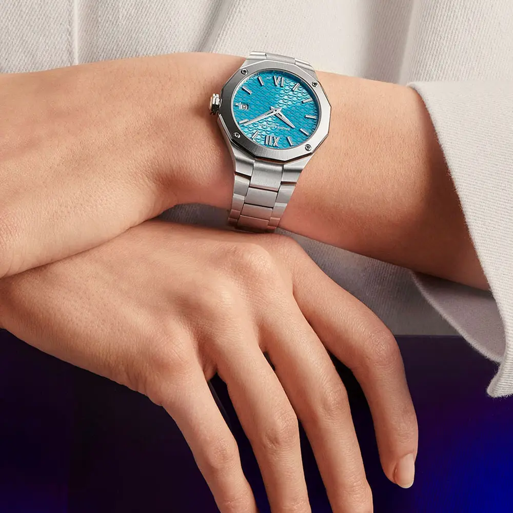 Mặt số màu xanh nhạt với họa tiết gợn sóng tinh tế gợi cảm giác tươi mới như đại dương. Kim và cọc số màu bạc, cùng số La Mã tại vị trí 12 và 6 giờ, đảm bảo khả năng đọc rõ ràng; lịch ngày tại vị trí 3 giờ mang lại sự tiện dụng hàng ngày.