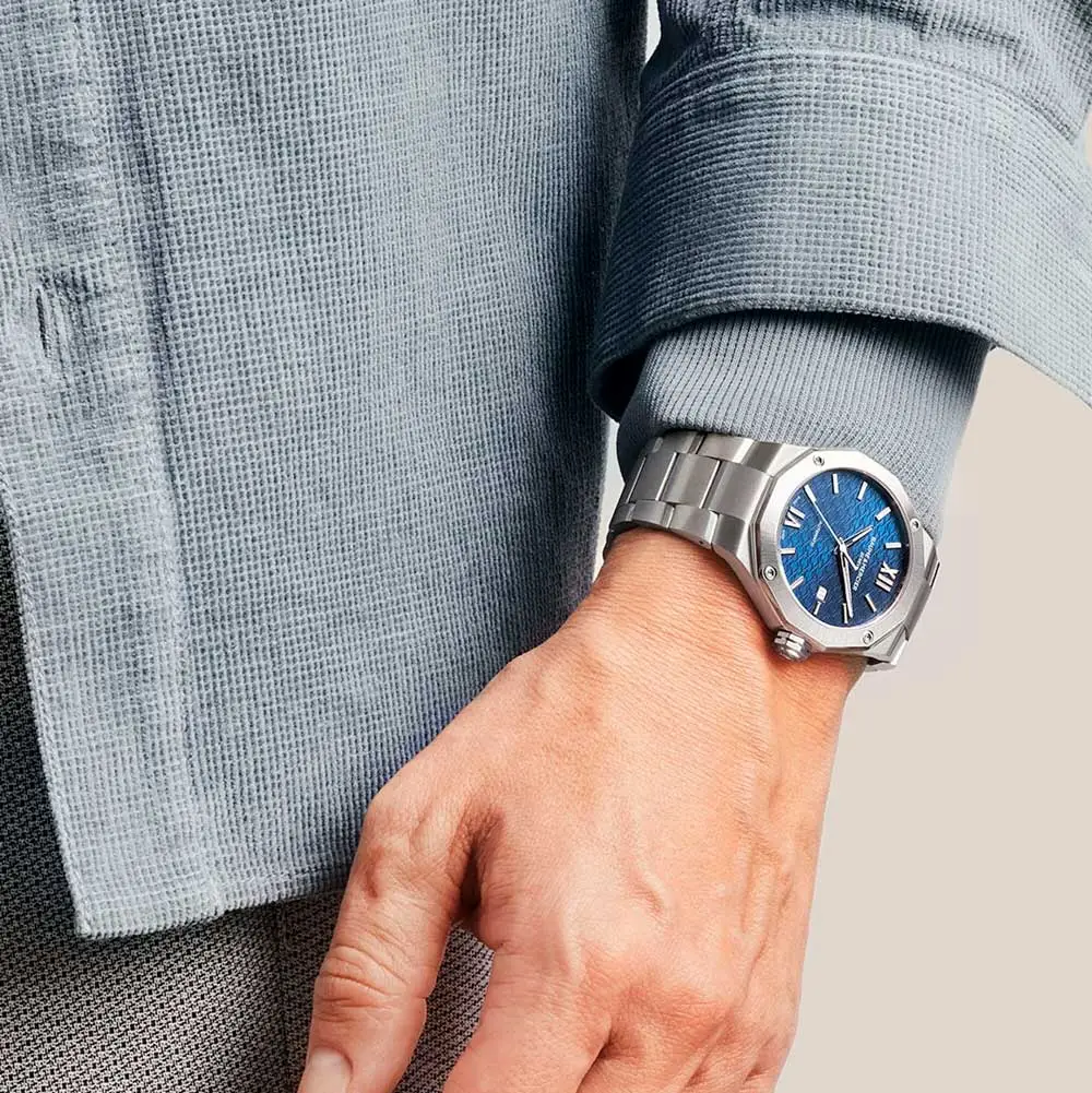 Vỏ thép không gỉ 42 mm kết hợp kính sapphire chống trầy xước, bảo vệ mặt số xanh họa tiết tinh tế với lịch ngày ở vị trí 3 giờ, mang lại vẻ thanh lịch và tiện dụng.