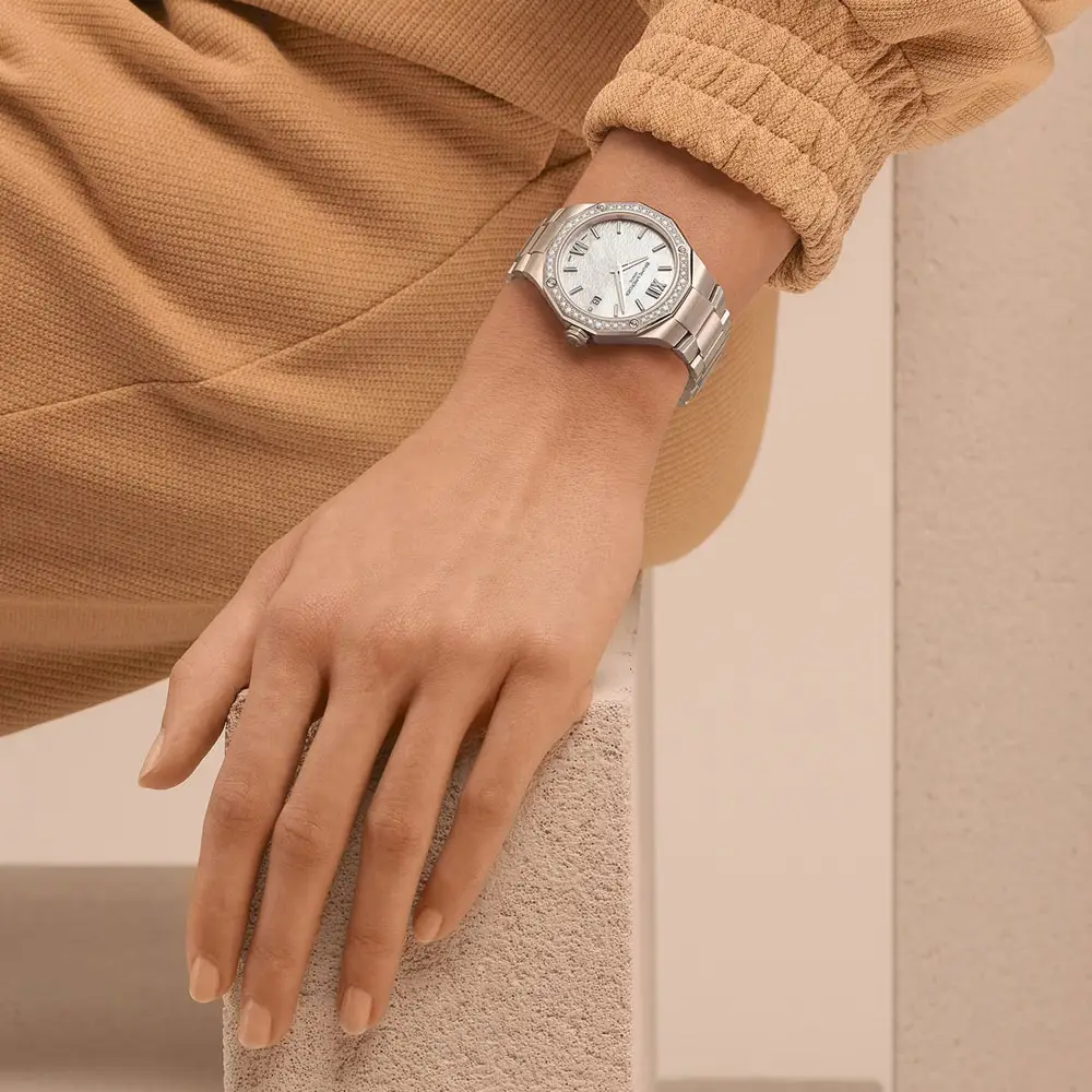 Vỏ thép không gỉ 36 mm được tô điểm bằng vành bezel nạm kim cương, mang lại vẻ rực rỡ và thanh lịch. Mặt số xà cừ mềm mại, tỏa sáng nhẹ nhàng và được bảo vệ bởi kính sapphire chống trầy xước. Lịch ngày tại vị trí 3 giờ mang đến sự tiện dụng và cân đối trong thiết kế.