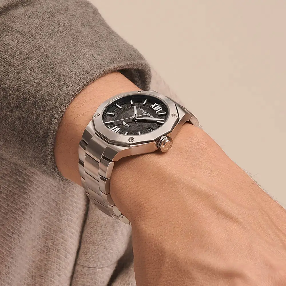Vỏ thép không gỉ tròn 42 mm đặc trưng kết hợp với vòng bezel mười hai cạnh đặc trưng, tạo nên diện mạo không thể nhầm lẫn. Kính sapphire bảo vệ mặt số analog màu đen thanh lịch, hiển thị rõ ràng thời gian và một ô lịch ngày tinh tế tại vị trí 3 giờ.