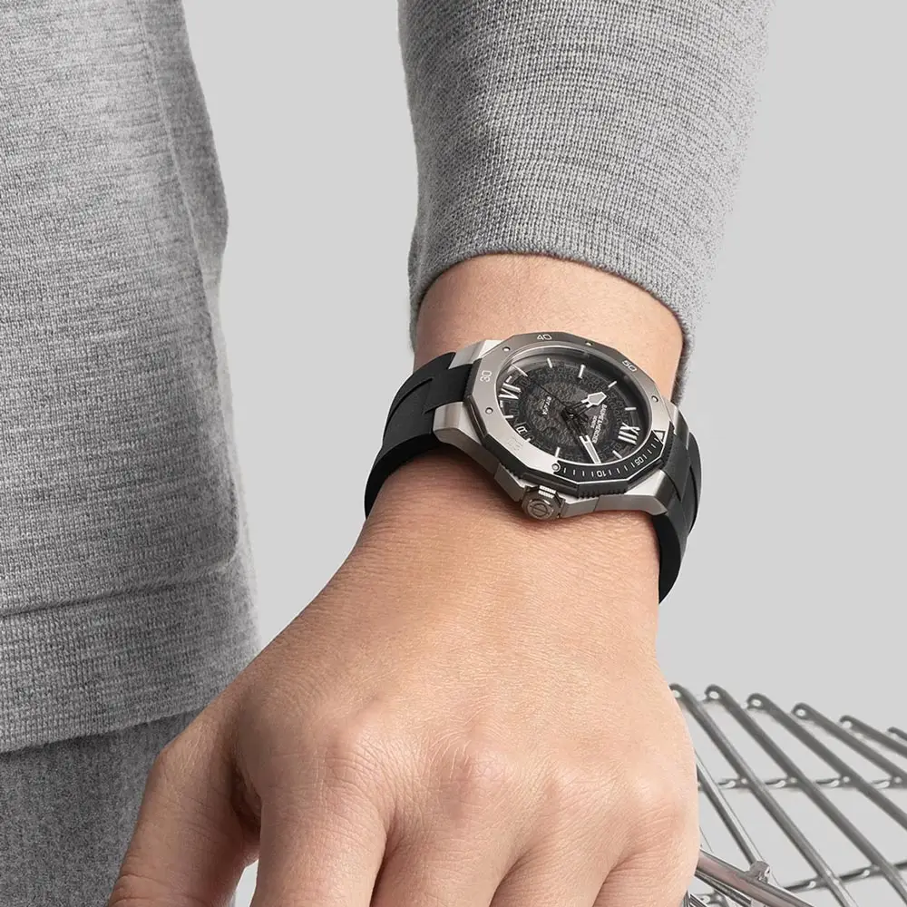 Vỏ thép không gỉ tròn 42 mm chắc chắn với vòng bezel mười hai cạnh đặc trưng, tạo nên vẻ ngoài năng động và hiện đại. Kính sapphire bảo vệ mặt số khỏi trầy xước và đảm bảo khả năng hiển thị rõ nét. Mặt số skeleton dễ quan sát được bổ sung bởi lịch ngày nhỏ gọn ở vị trí 3 giờ.