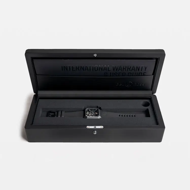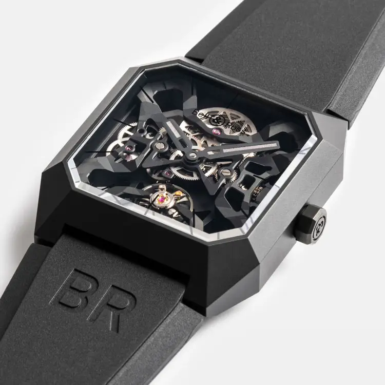 Vỏ vuông 42mm bằng gốm đen mờ mang lại độ bền cao, trọng lượng nhẹ và vẻ hiện đại. Thiết kế liền khối không viền tạo nên hình dáng điêu khắc đa giác, trong khi kính sapphire chống phản quang bảo vệ mặt số skeleton phô bày cấu trúc cơ học tinh xảo bên trong.