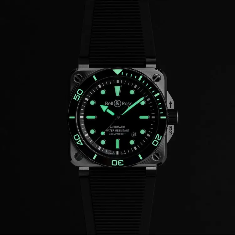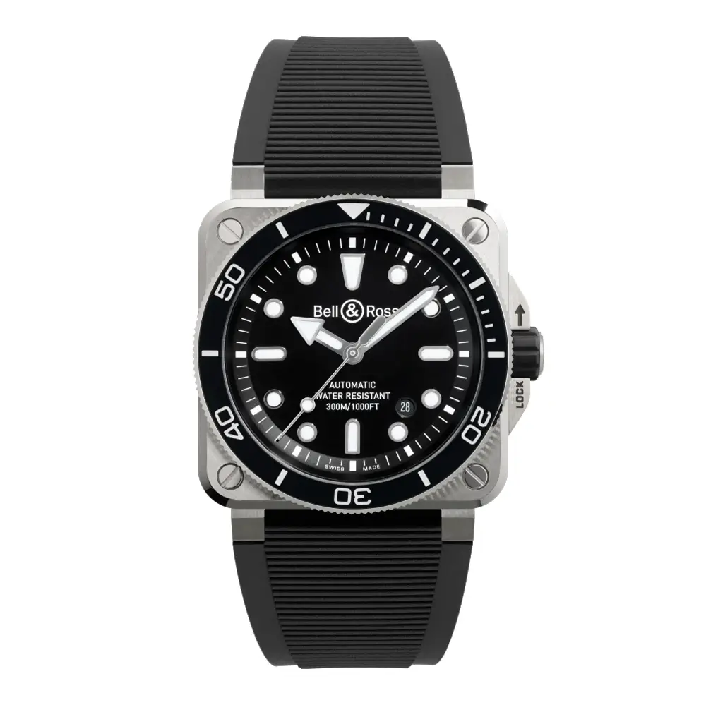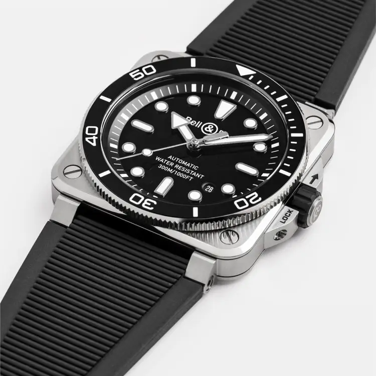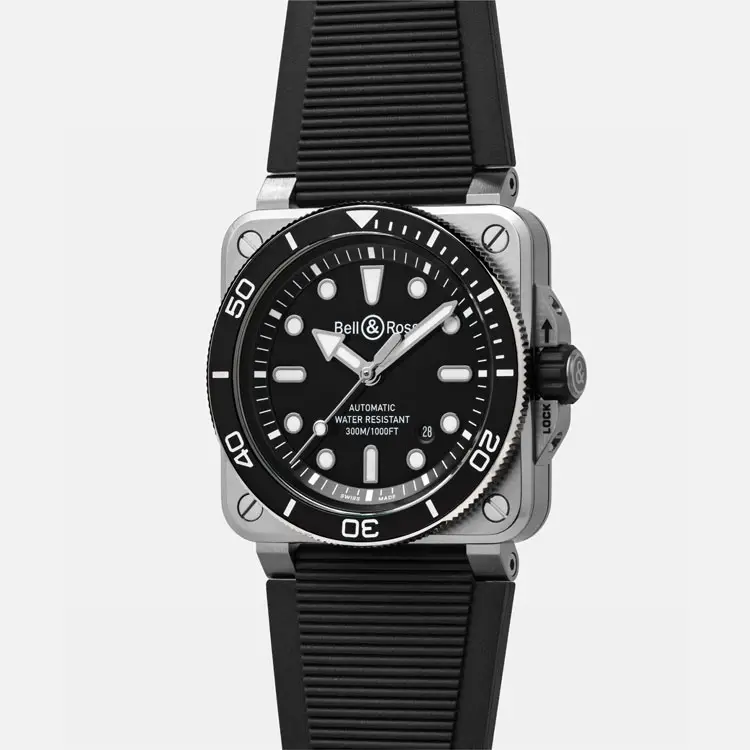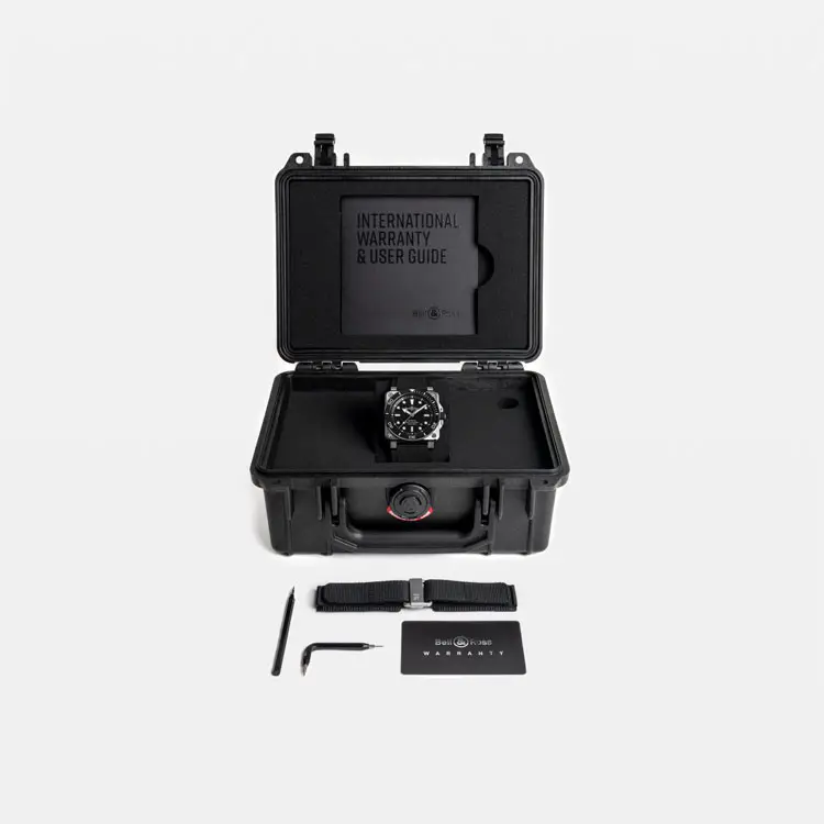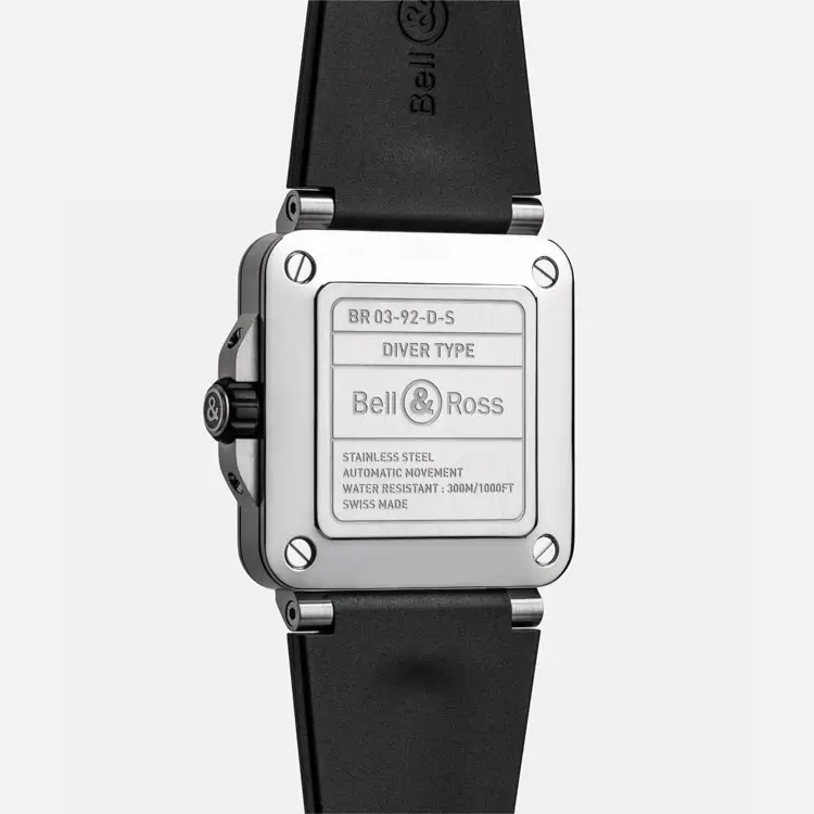 Bên trong là bộ máy cơ tự động BR-CAL.302-1 với dự trữ năng lượng 54 giờ, đảm bảo độ chính xác và ổn định. Dây cao su đen với khóa gài mang lại sự thoải mái và bền bỉ. Với khả năng chống nước 300m (30 bar) và chứng nhận ISO 6425, Bell & Ross BR 03 Diver Black Steel là biểu tượng của sức mạnh, phong cách và độ tin cậy chuyên nghiệp.