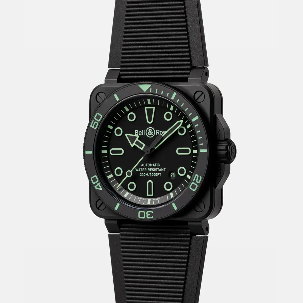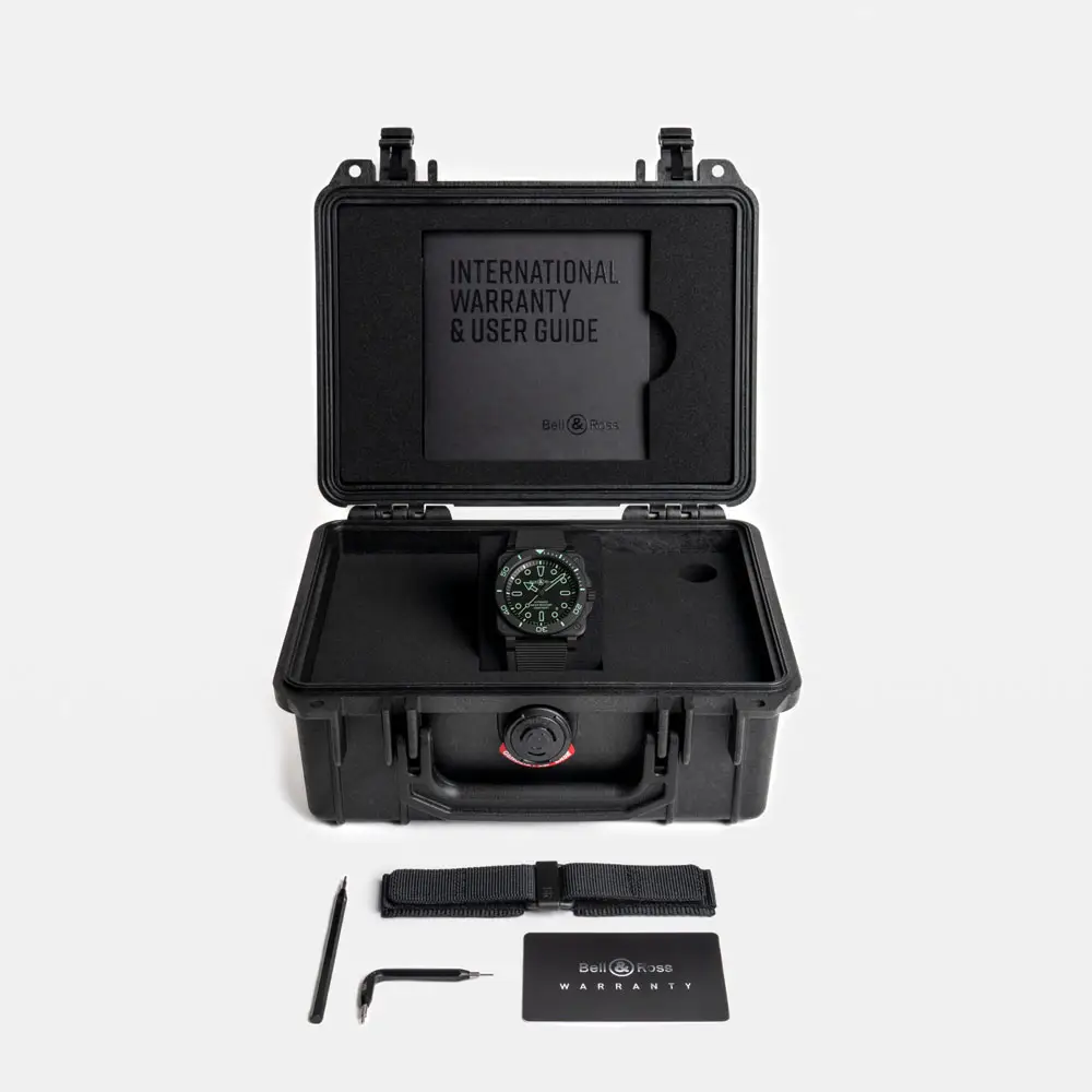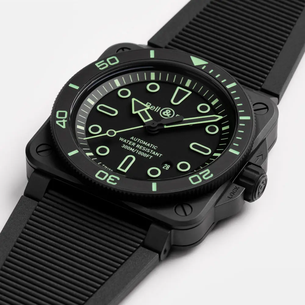 Mẫu BR 03-92 Diver LUM Outline thuộc bộ sưu tập BR 03 của Bell & Ross kết hợp các tính năng lặn chuyên nghiệp với thiết kế tối giản, gần như đơn sắc. Vỏ đồng hồ bằng gốm chắc chắn có đường kính 42 mm đảm bảo độ bền cao chống trầy xước và ăn mòn, trong khi bề mặt mờ giúp giảm chói và tôn lên vẻ kỹ thuật của đồng hồ.