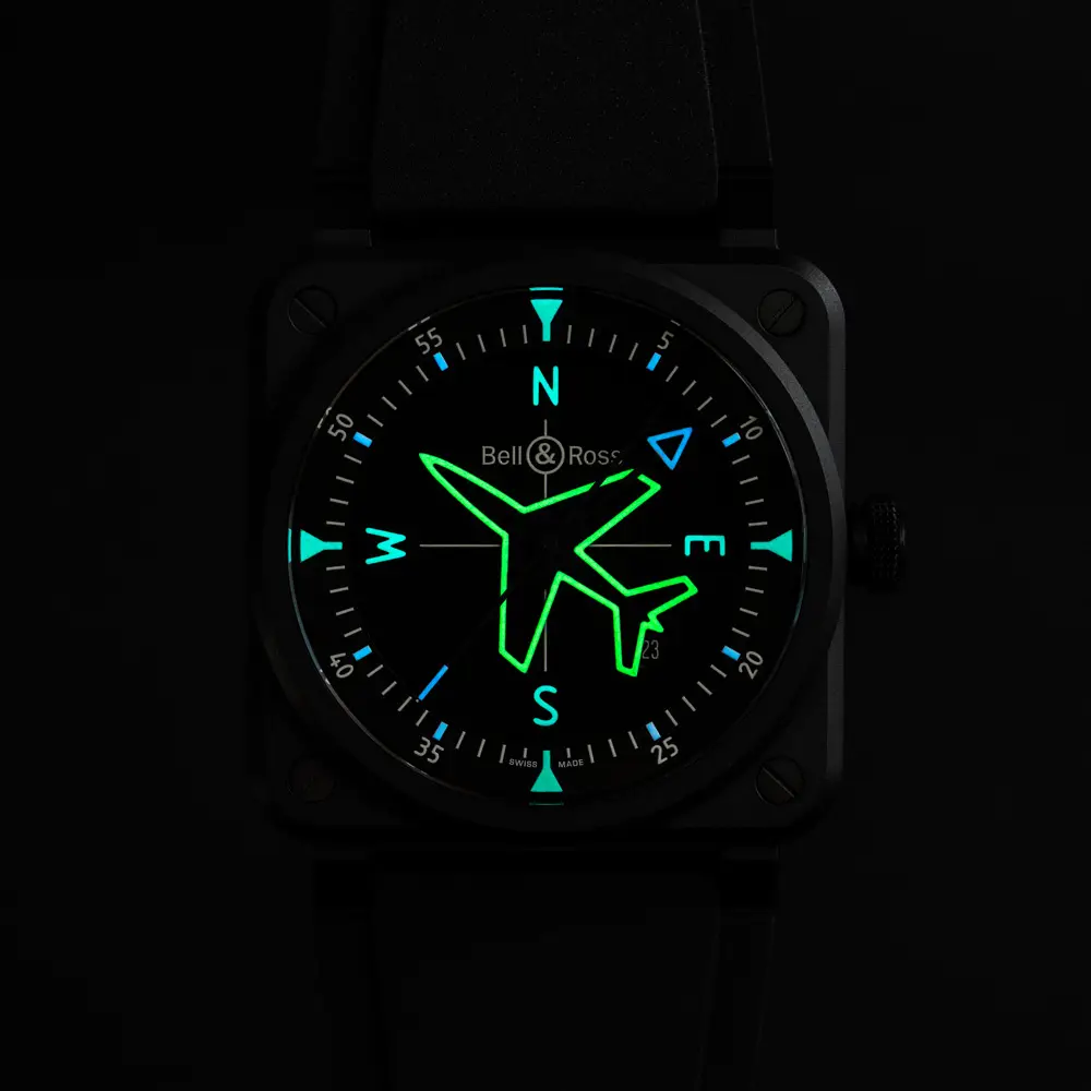 Vỏ gốm đen mờ 41 × 41 mm nhẹ, bền và chống trầy xước cao. Mặt kính sapphire chống phản chiếu bảo vệ mặt số đen phong cách buồng lái, nổi bật với các ký hiệu phương hướng phát sáng (N, E, S, W) và kim giờ hình máy bay, tạo điểm nhấn độc đáo.