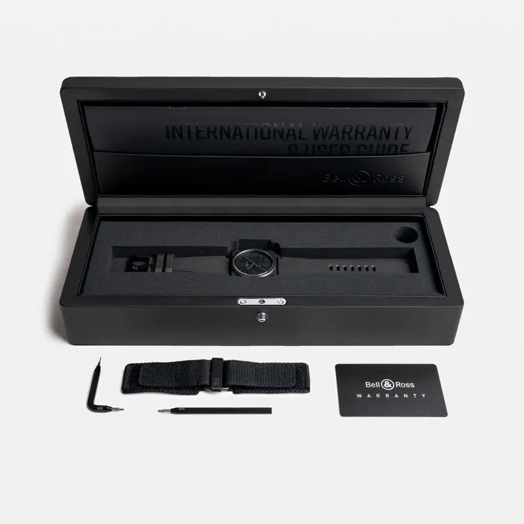 Bên trong là bộ máy cơ tự động BR-CAL.302 với dự trữ năng lượng 54 giờ, mang lại độ chính xác ổn định. Dây cao su đen với khóa gài thoải mái và chắc chắn. Với khả năng chống nước 100m (10 bar), Bell & Ross BR 03 Phantom là biểu tượng của sức mạnh, sự tinh tế và phong cách kín đáo vượt thời gian.