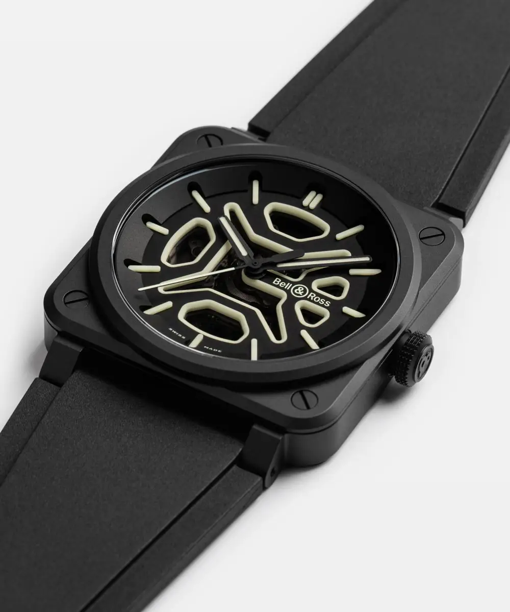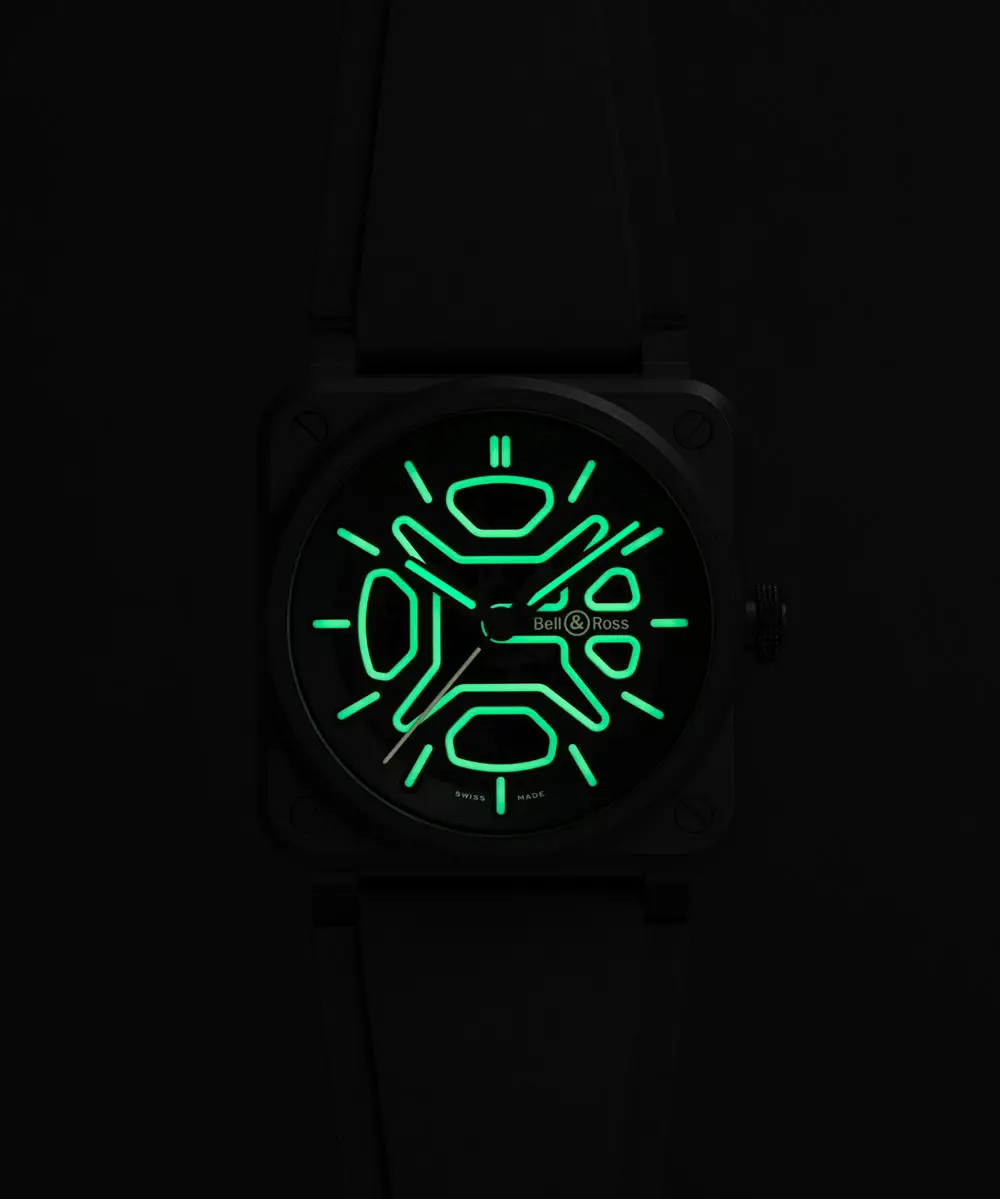 Mẫu đồng hồ này được sản xuất giới hạn 250 chiếc và được cung cấp với dây đeo cao su màu đen có thể thay thế bằng dây đeo Velcro lấy cảm hứng từ ngành hàng không chuyên nghiệp. BR-03 Skeleton Lum Ceramic là một món đồ sưu tập nổi bật, kết hợp kỹ thuật chế tác đồng hồ hàng đầu với phong cách táo bạo và độc đáo của Bell & Ross.