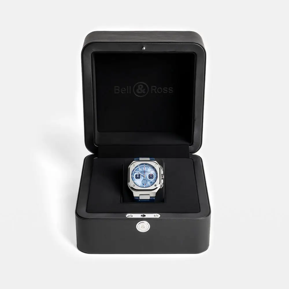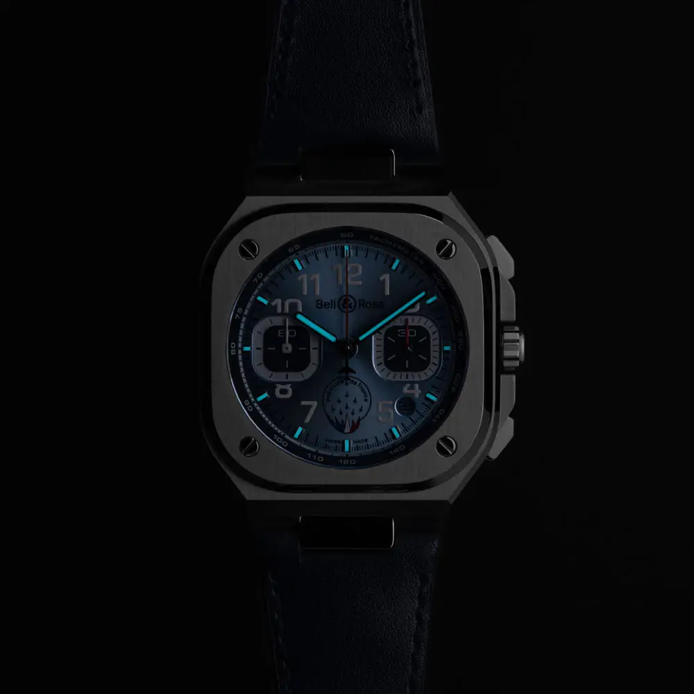 Bên trong là bộ máy cơ tự động BR-CAL.326 với dự trữ năng lượng 60 giờ và các chức năng chronograph, giây nhỏ và lịch ngày. Đi kèm dây da xanh với đường chỉ ba màu và khả năng chống nước 100 m (10 ATM). Giới hạn 500 chiếc, BR 05 Chrono Patrouille de France là sự hòa quyện hoàn hảo giữa hiệu suất, phong cách và tinh thần hàng không.