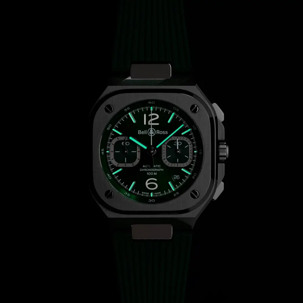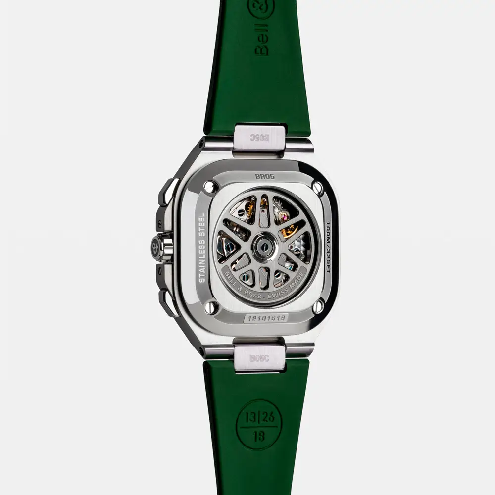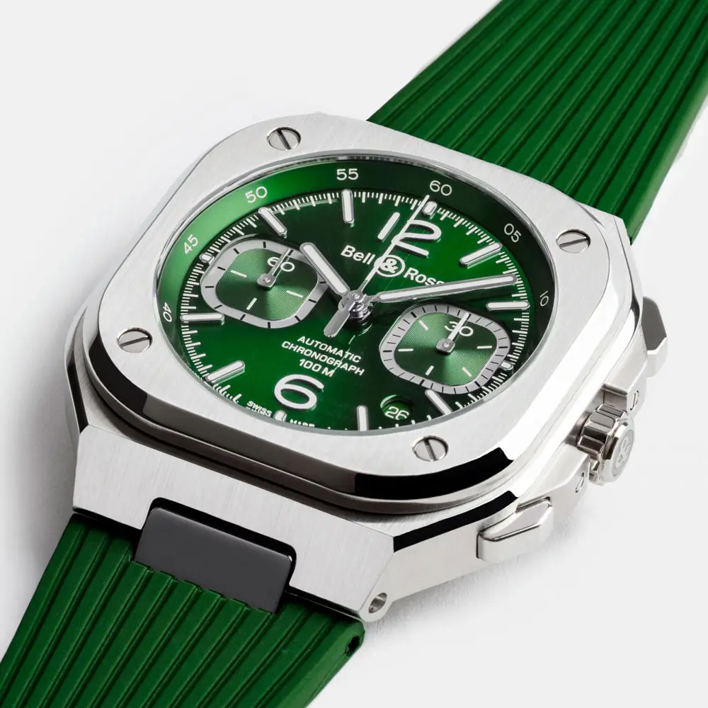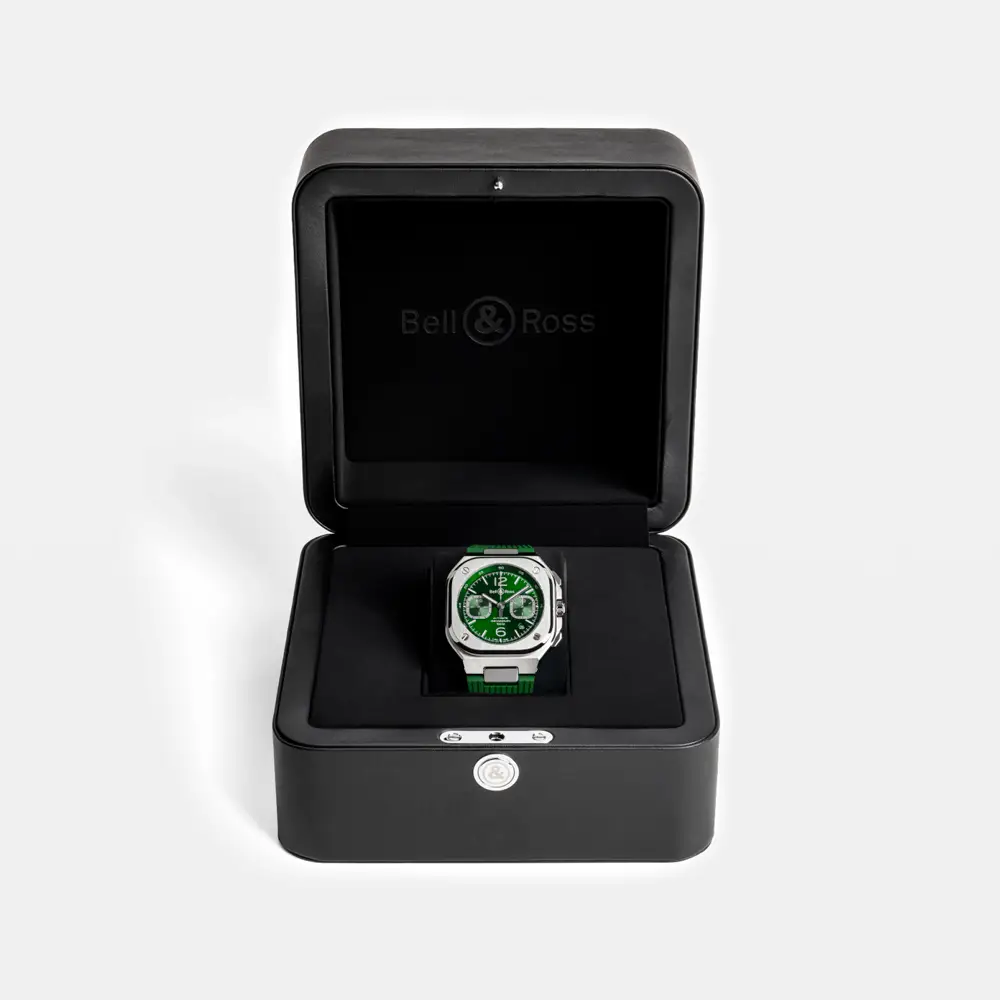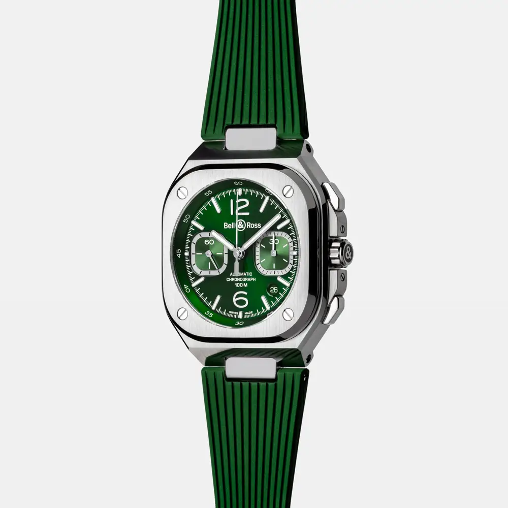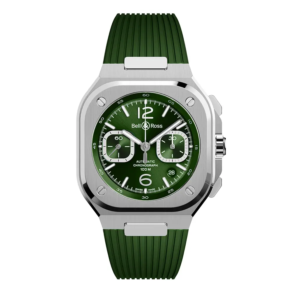 Bên trong là bộ máy cơ tự động BR-CAL.326 với chức năng chronograph và dự trữ năng lượng khoảng 60 giờ. Với khả năng chống nước 100 m (10 ATM) cùng dây thép không gỉ và khóa gập, BR 05 Chrono Green Steel là biểu tượng của năng lượng, hiệu suất và phong cách đương đại.