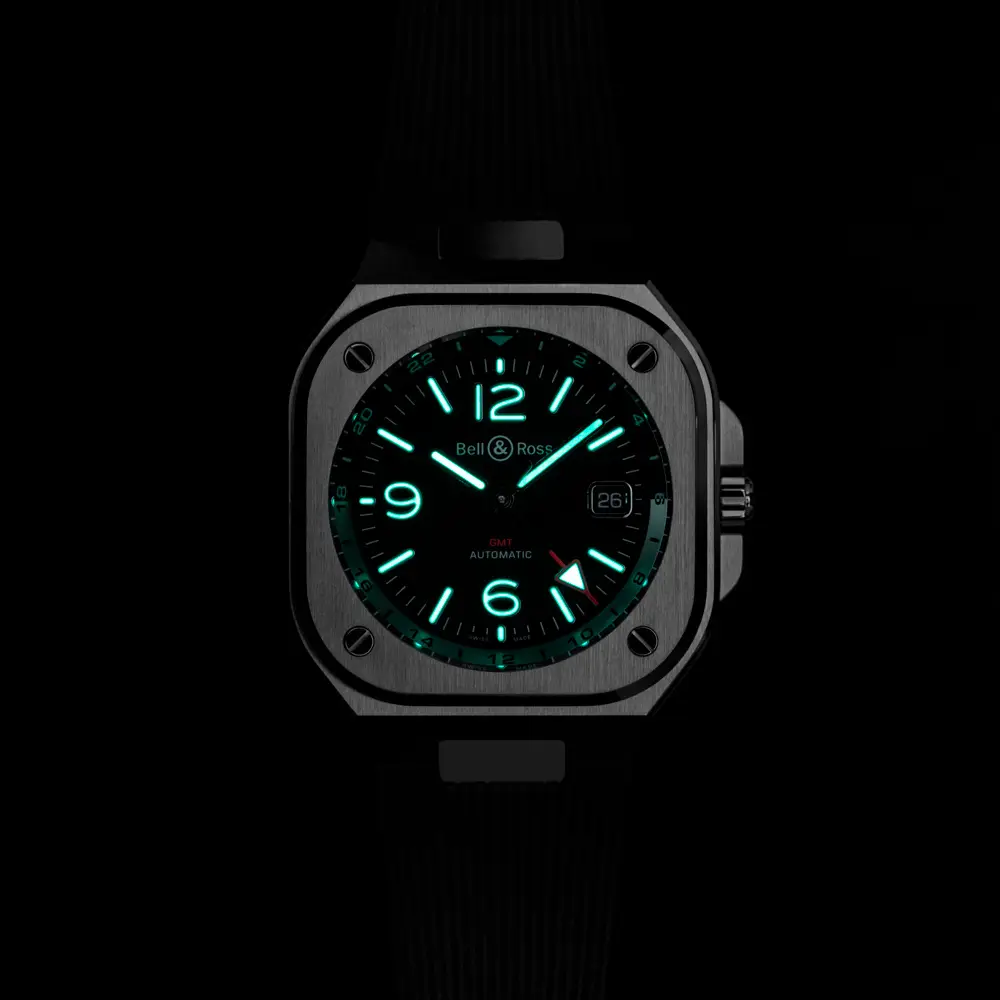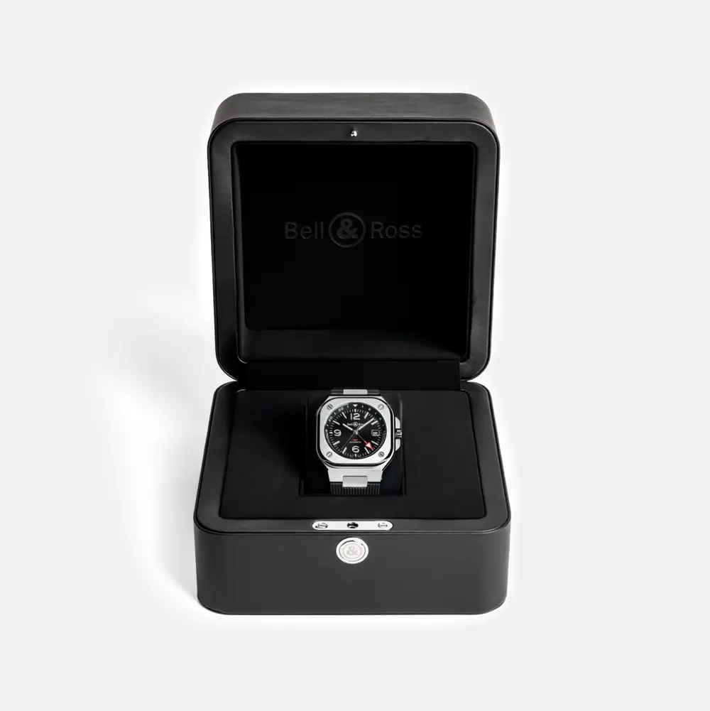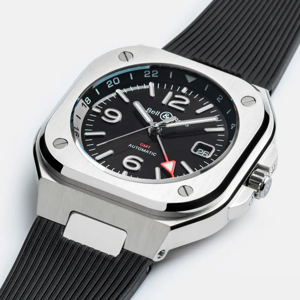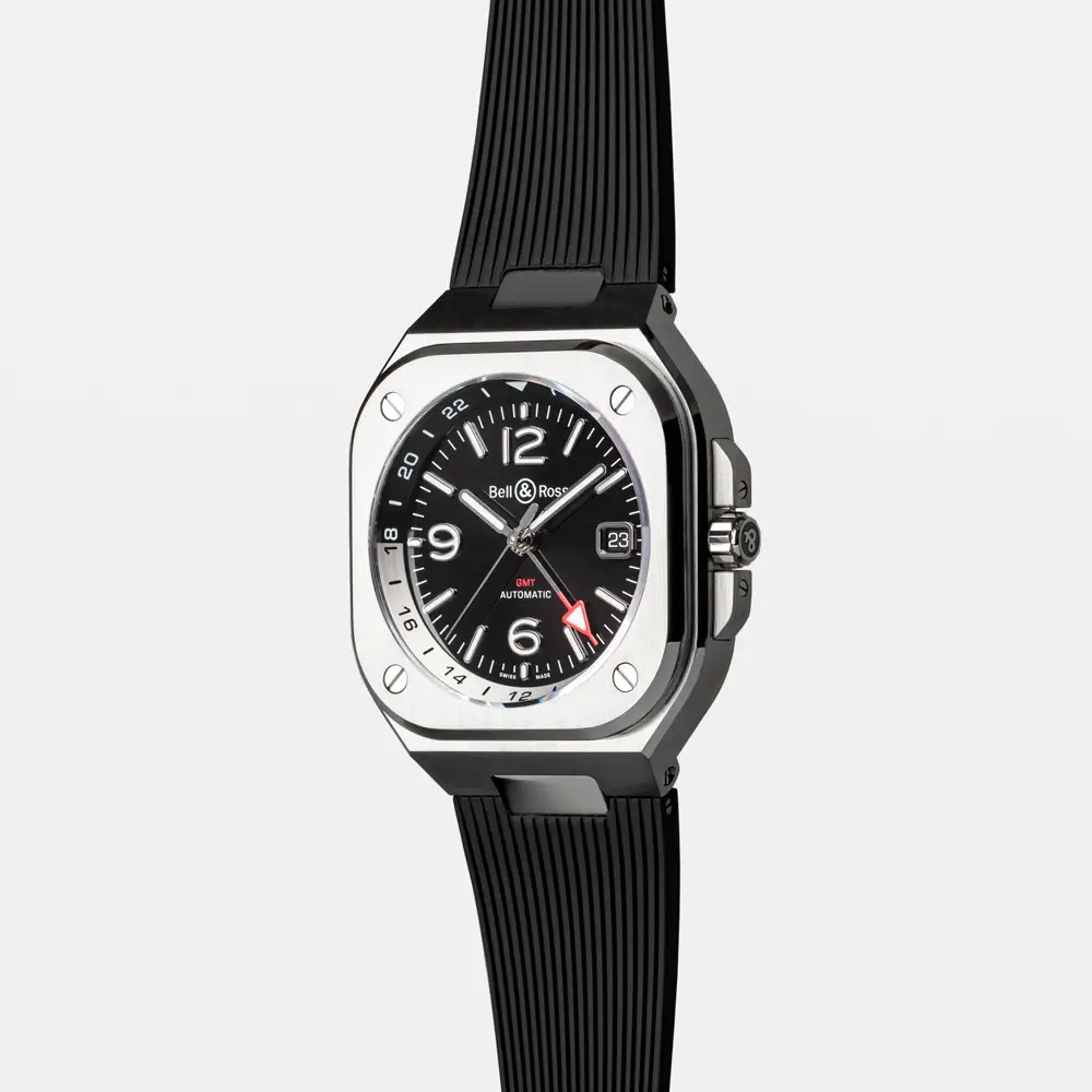 Bell & Ross BR 05 GMT kết hợp phong cách thanh lịch với tính năng thiết thực. Vỏ thép không gỉ vuông 41 mm mạnh mẽ, trong khi mặt số đen với kim GMT màu đỏ giúp dễ dàng đọc giờ của múi giờ thứ hai.