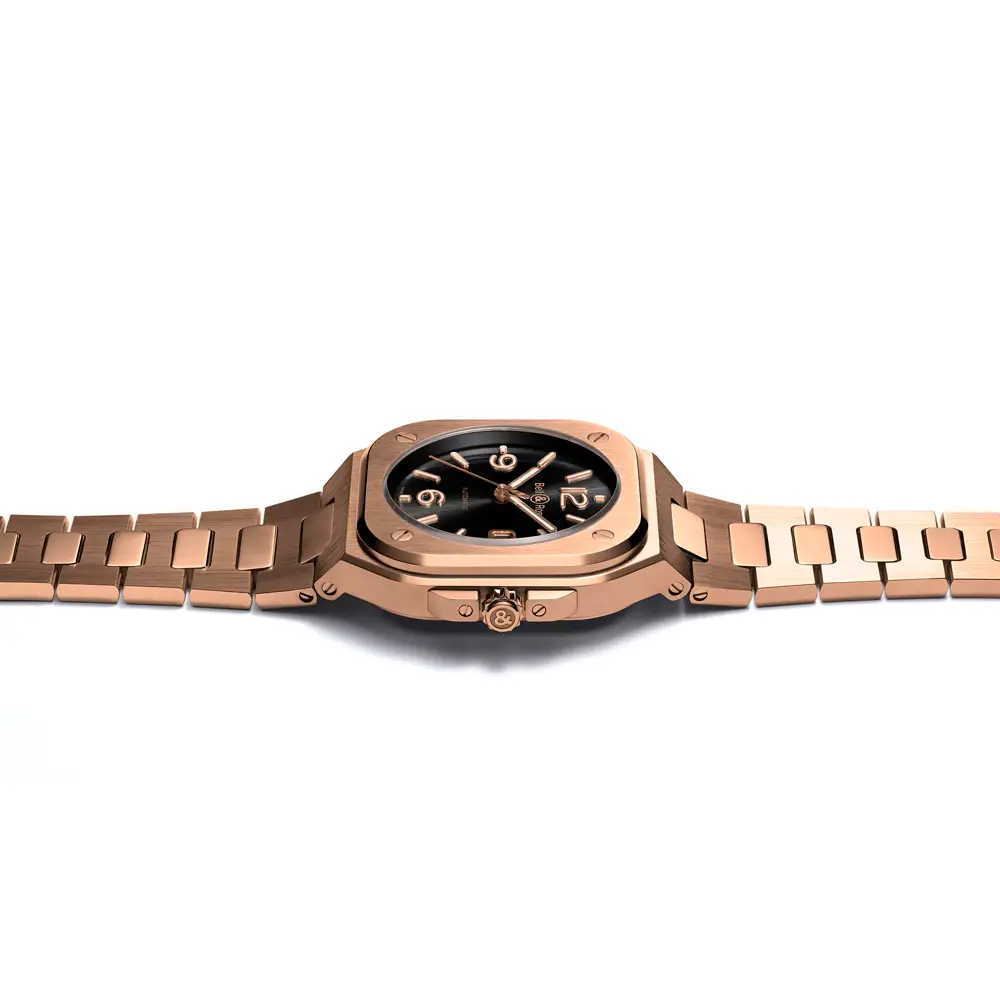 Mẫu đồng hồ Bell & Ross BR 05 Gold là sự kết hợp tinh tế giữa sự sang trọng và độ chính xác kỹ thuật cao. Vỏ hình vuông bằng vàng hồng 18kt tạo nên vẻ ngoài tinh tế và mang hơi hướng hiện đại. Với đường kính 40 mm, đồng hồ vừa vặn trên cổ tay mà vẫn thể hiện phong cách nổi bật, trong khi kính sapphire bảo vệ mặt số và bộ máy khỏi trầy xước.