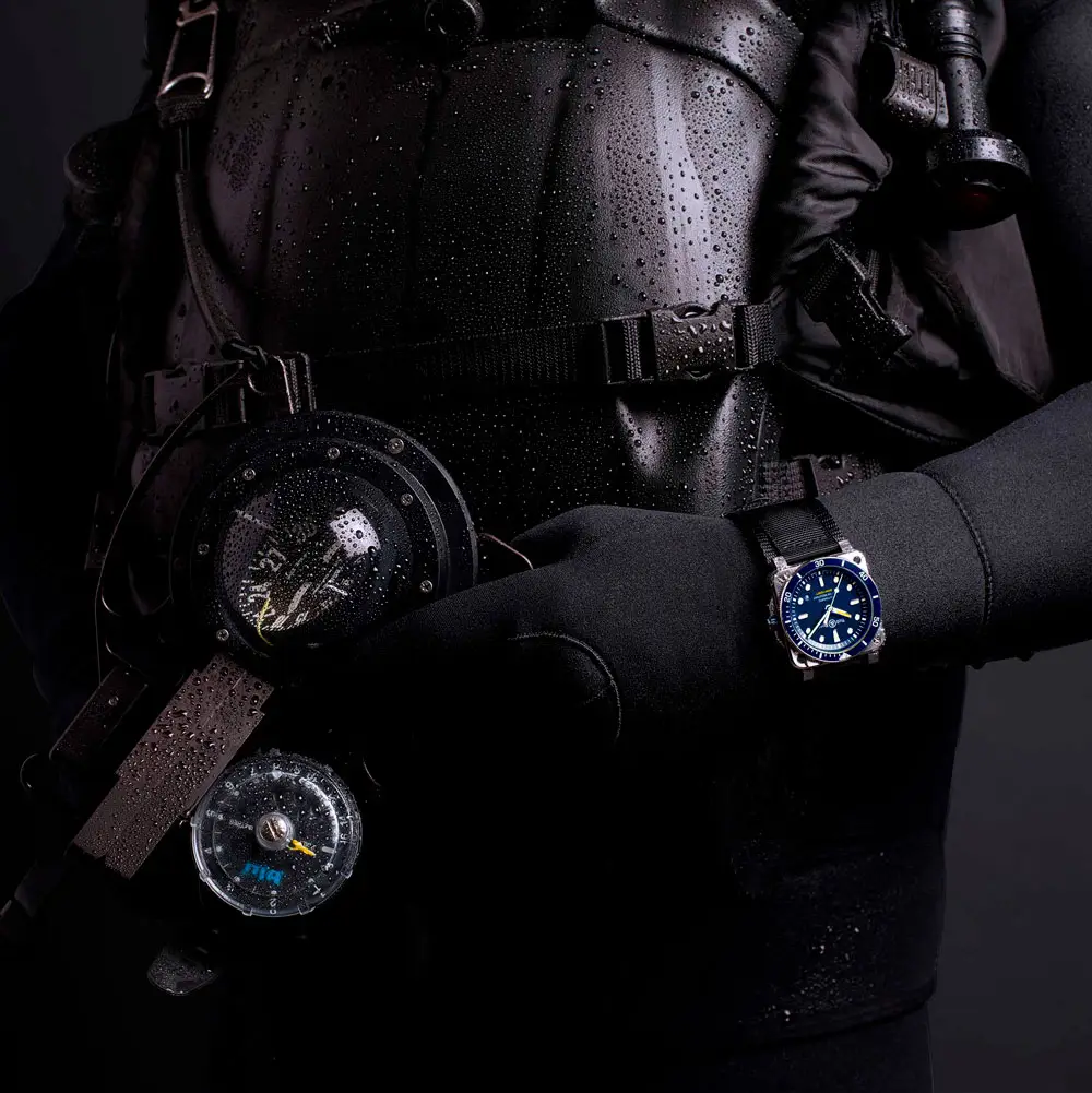 Vỏ thép không gỉ 42 mm mang vẻ chắc chắn nhưng tinh tế. Mặt kính sapphire chống phản chiếu bảo vệ mặt số màu xanh biển với kim và cọc số phủ dạ quang, giúp dễ dàng đọc giờ ngay cả dưới đáy đại dương. Vành bezel xoay đơn hướng và núm vặn khóa chống nước khẳng định khả năng hoạt động chuyên nghiệp.