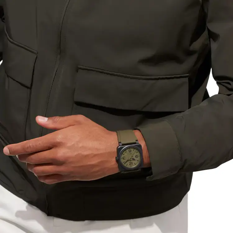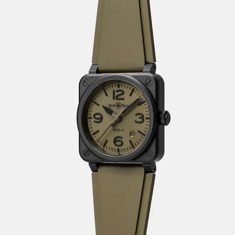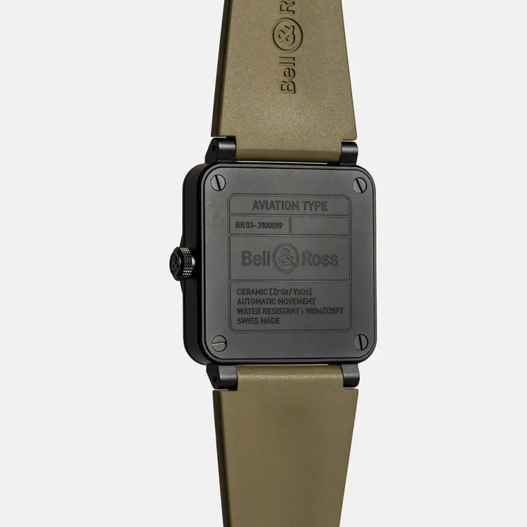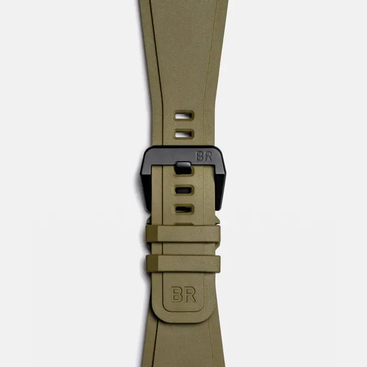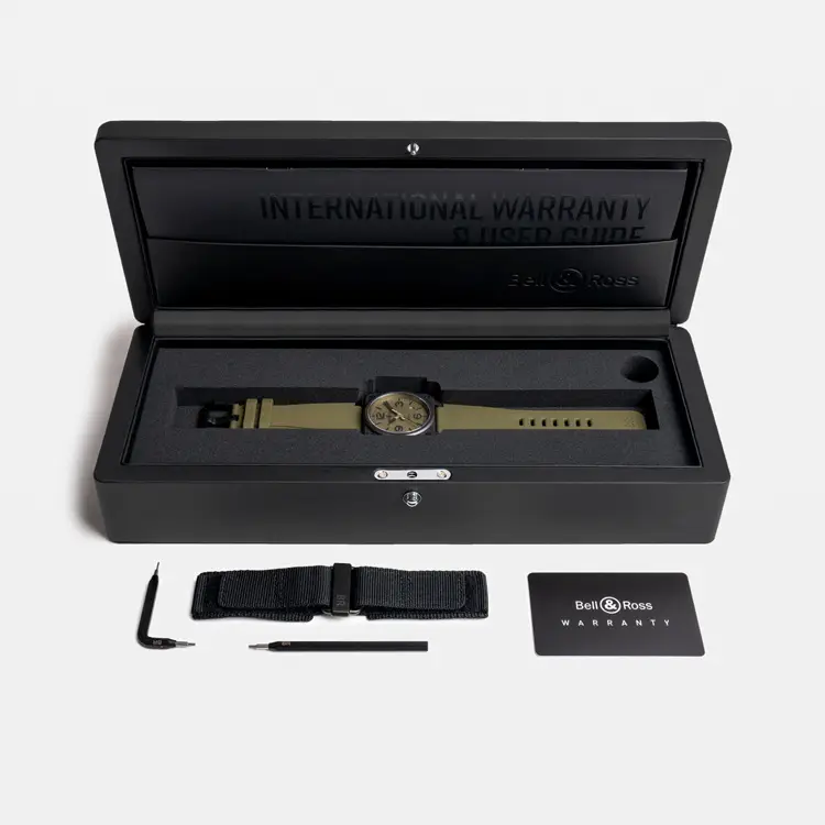 Bên trong là bộ máy cơ tự động BR-CAL.302 với dự trữ năng lượng 54 giờ và lịch ngày giữa vị trí 4 và 5 giờ. Dây cao su màu kaki với khóa gài hoàn thiện phong cách quân đội mạnh mẽ. BR 03 Military Ceramic là biểu tượng của sức mạnh, độ chính xác và tinh thần chiến thuật.