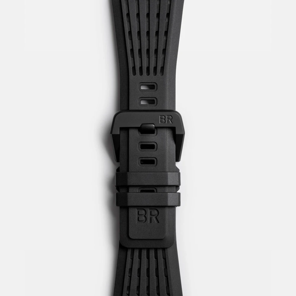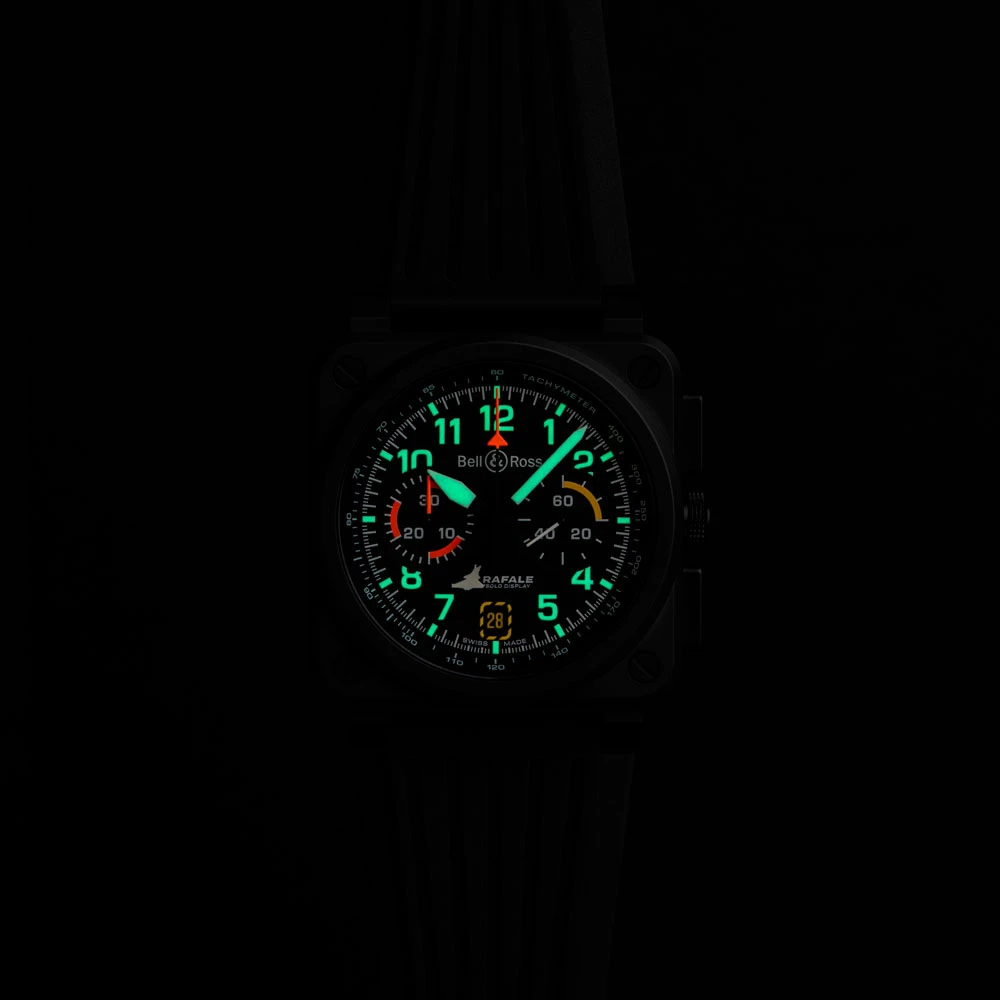 Bên trong là bộ máy chronograph automatic BR-CAL.301, với khả năng trữ cót 42 giờ. Mặt số đen mờ được trang bị chữ số Ả Rập trắng phủ dạ quang, kim chronograph màu cam nổi bật và chi tiết hình dáng chiến đấu cơ Rafale trên kim giây – chữ ký tinh tế của phiên bản đặc biệt.