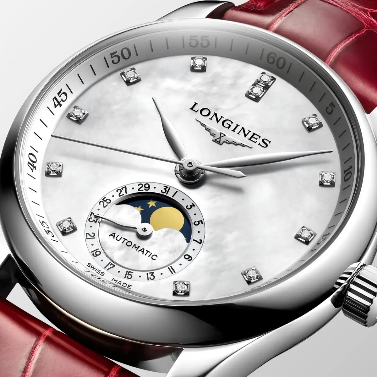 Mặt số analog xà cừ tinh tế đính kim cương tạo nên diện mạo sang trọng và được bổ sung bởi cửa sổ ngày thực dụng cùng chức năng lịch tuần trăng, tăng thêm nét tinh tế cho mẫu đồng hồ.
