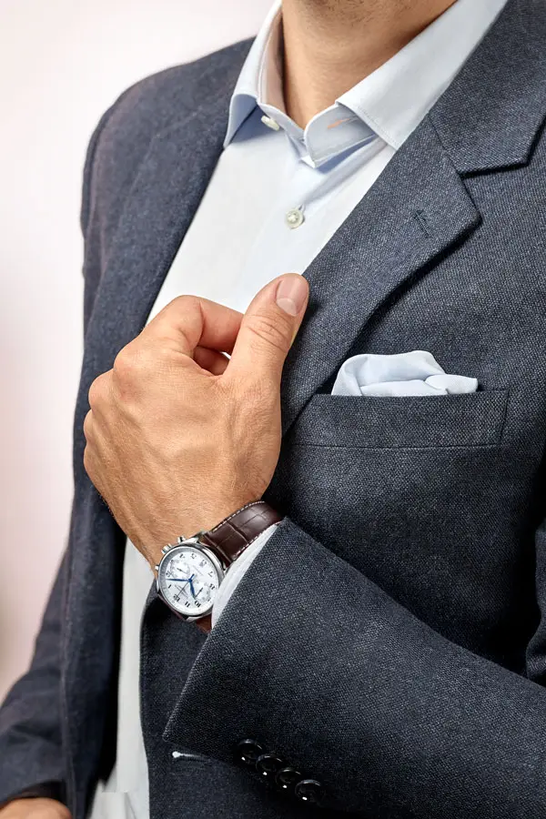 Trên mặt số bạc họa tiết “barleycorn”, các kim thép xanh, chữ số Ả Rập và mặt số phụ chronograph nổi bật. Ô lịch ngày tại vị trí 6 giờ mang lại sự cân đối, trong khi chức năng chronograph tạo nên phong cách thể thao - thanh lịch.