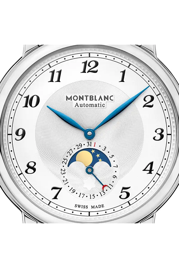 Điểm nhấn nổi bật là mặt số màu trắng với hoa văn guilloché, các cọc số được gắn thủ công và chức năng lịch tuần trăng tại vị trí 6 giờ, tạo nên sự duyên dáng và thơ mộng. Bên trên là cửa sổ hiển thị ngày, tăng tính tiện dụng cho người dùng. Đồng hồ được trang bị bộ máy cơ tự động chính xác và ổn định, không cần lên dây thủ công.