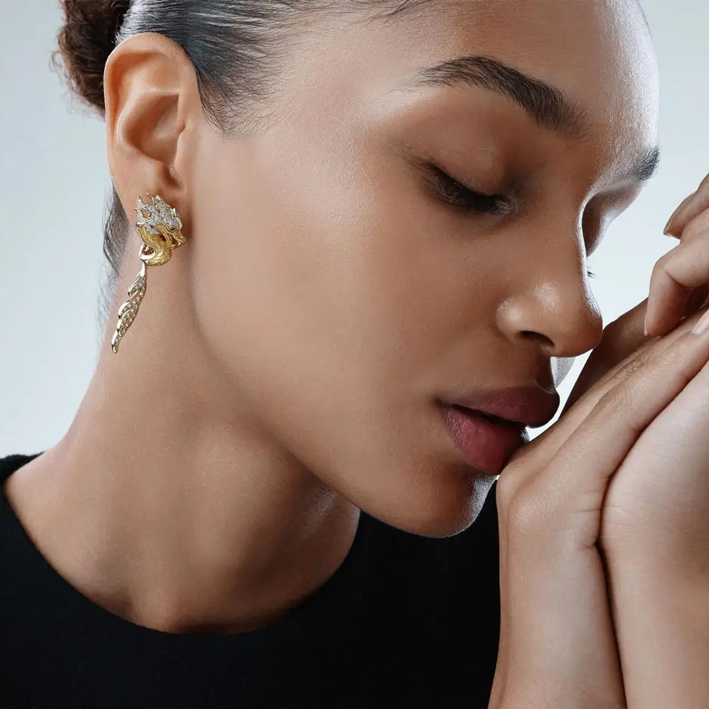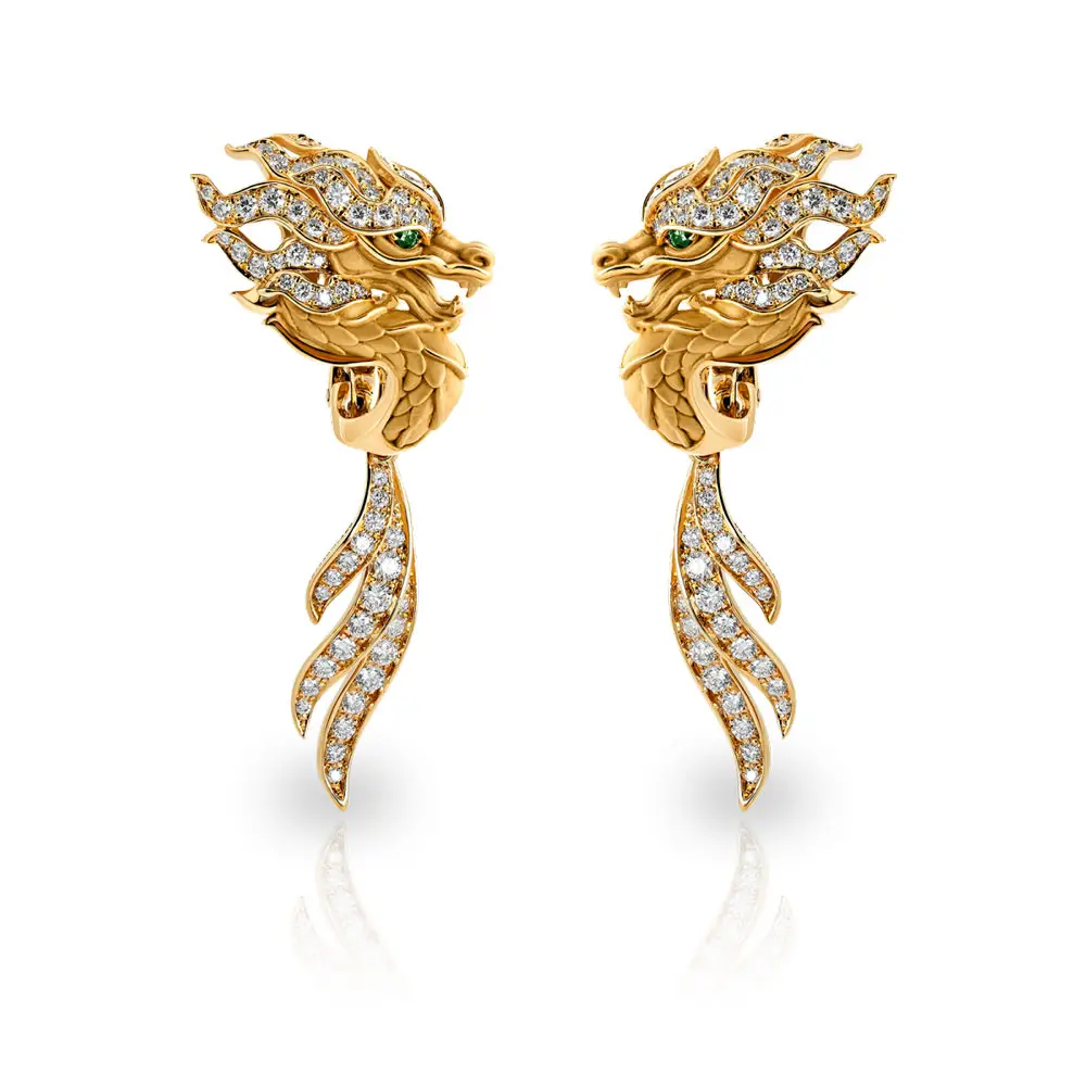 Chi tiết nổi bật là bốn viên kim cương xanh nặng tổng cộng 0.07 carat, đóng vai trò là đôi mắt của rồng, mang đến cho món trang sức vẻ độc đáo - sống động, mạnh mẽ và khó quên. Đường cong duyên dáng của "tóc rồng" tạo nên một đường nét uốn lượn thanh lịch, khiến đôi bông tai trông động đậy và gợi cảm.