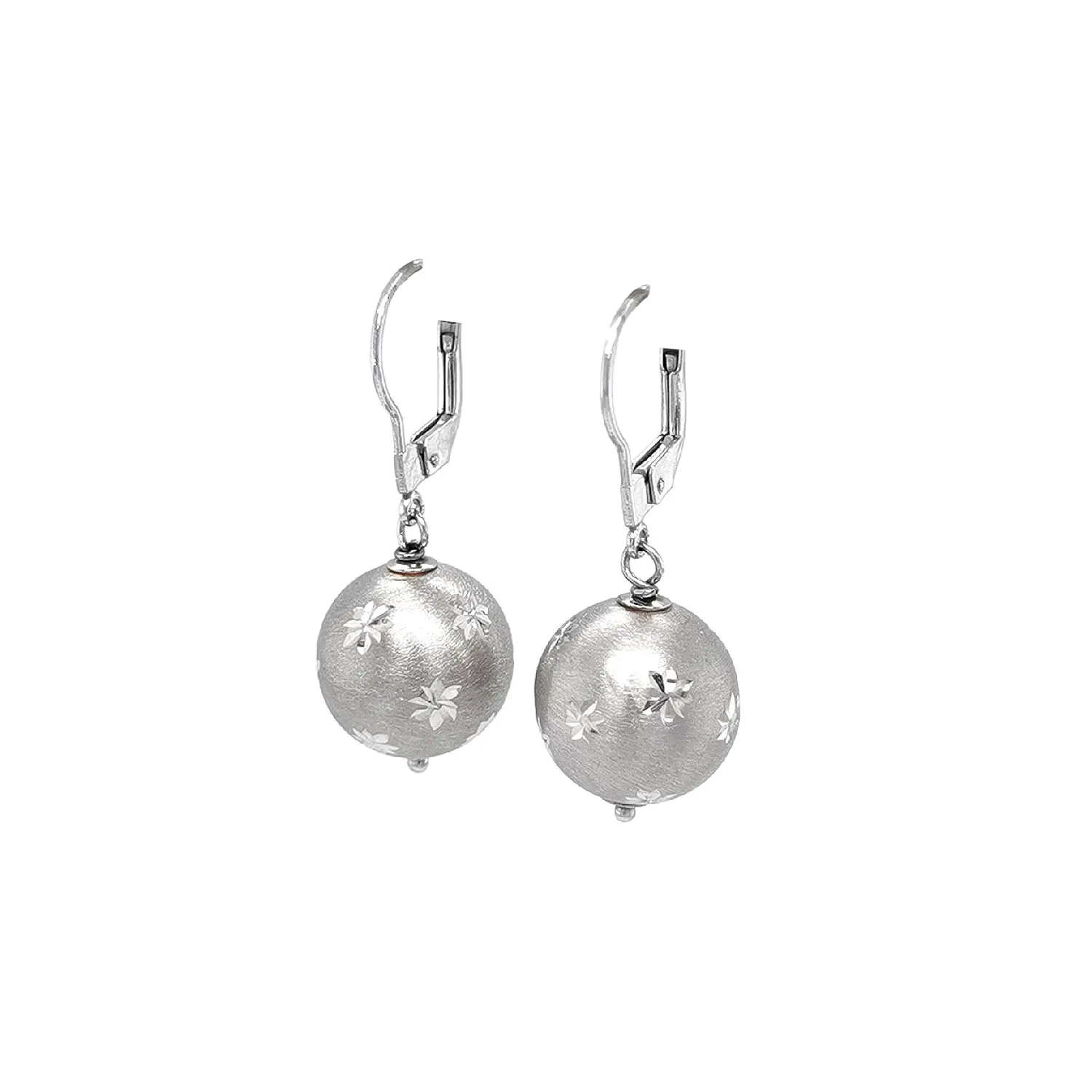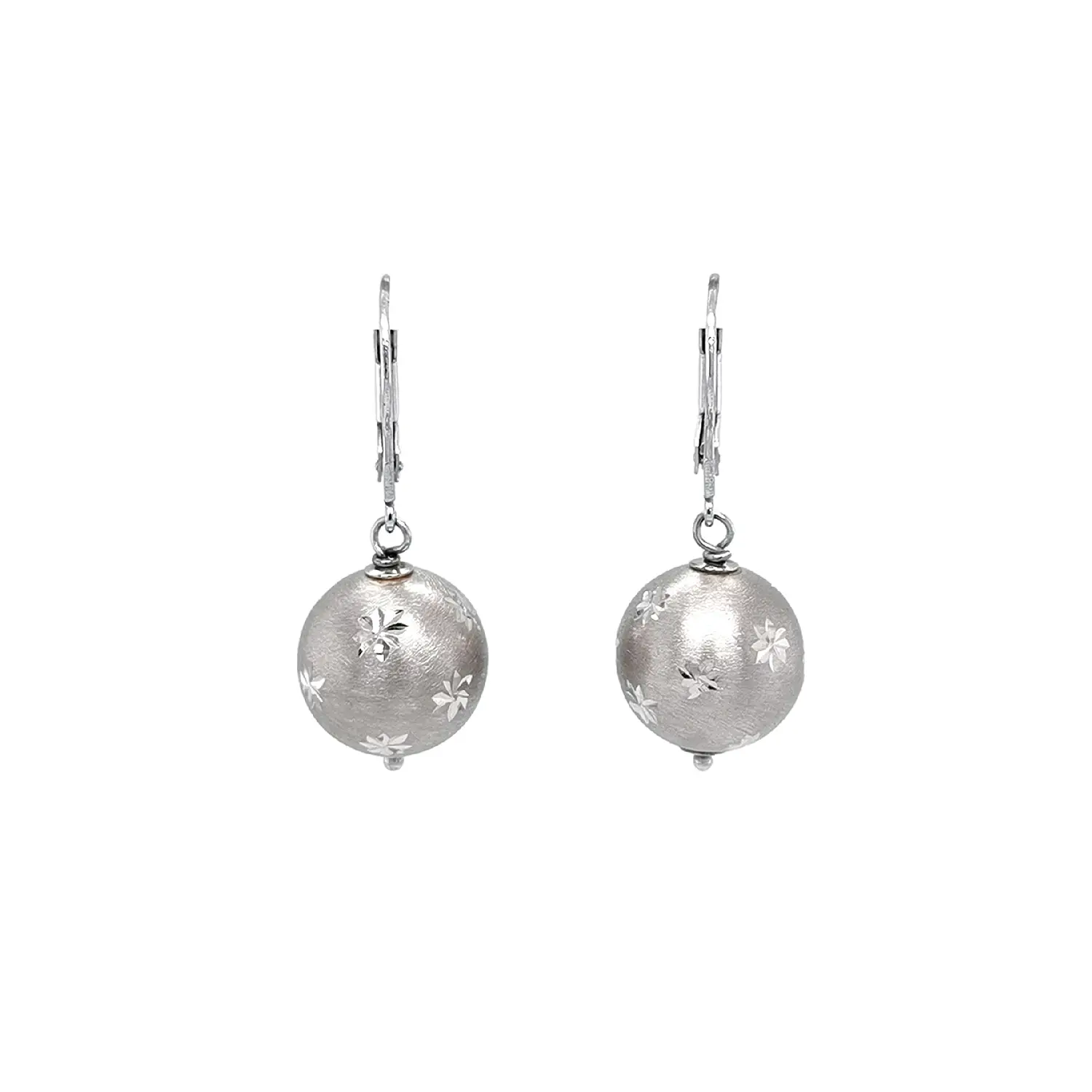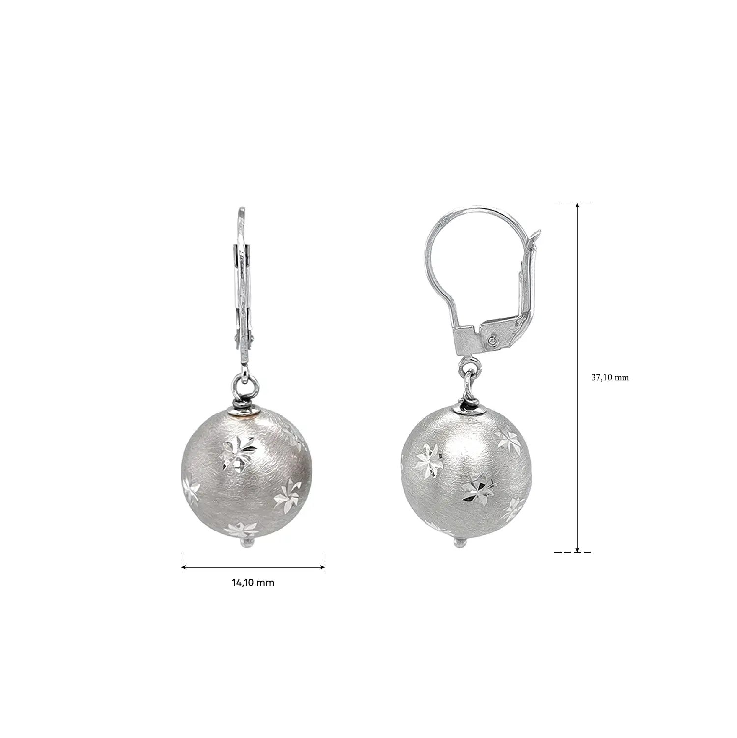 Đôi bông tai treo bằng vàng trắng với họa tiết hình cầu gây ấn tượng bởi bề mặt mờ tinh tế và các chi tiết khắc trang trí hình ngôi sao nhỏ. Sự kết hợp giữa hiệu ứng mờ và các điểm bóng nhẹ tạo nên vẻ tương phản thanh lịch, mang lại nét duyên dáng và trang nhã.