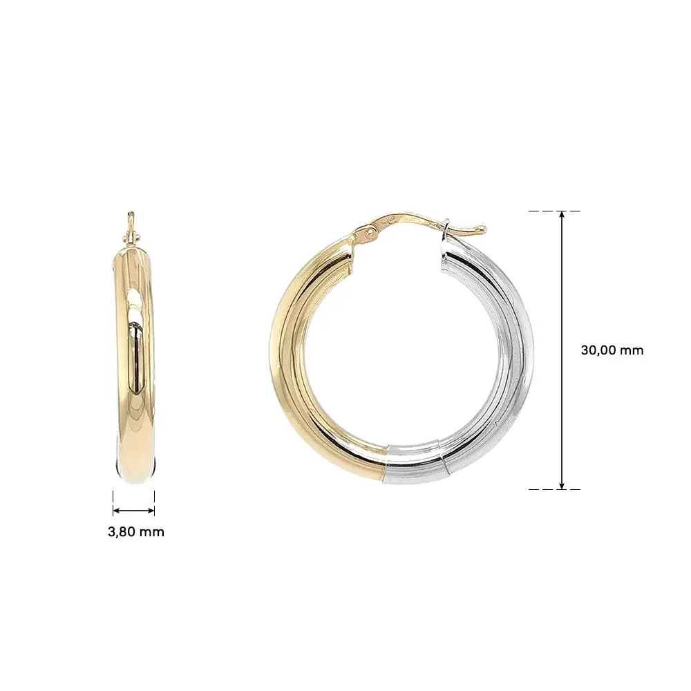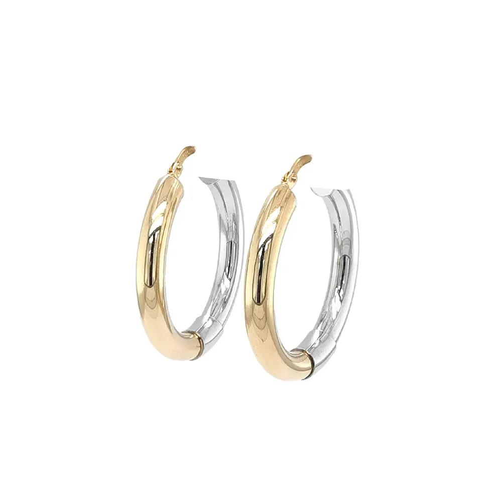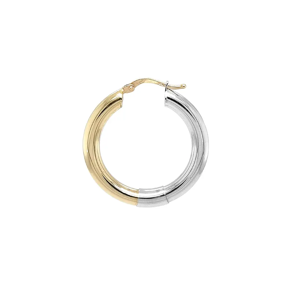 Bông tai tròn bằng vàng kết hợp nổi bật với đường nét tinh giản và sự tương phản hài hòa giữa vàng vàng và vàng trắng. Bề mặt đánh bóng cao cấp tôn lên vẻ sang trọng và tay nghề chế tác tinh xảo.