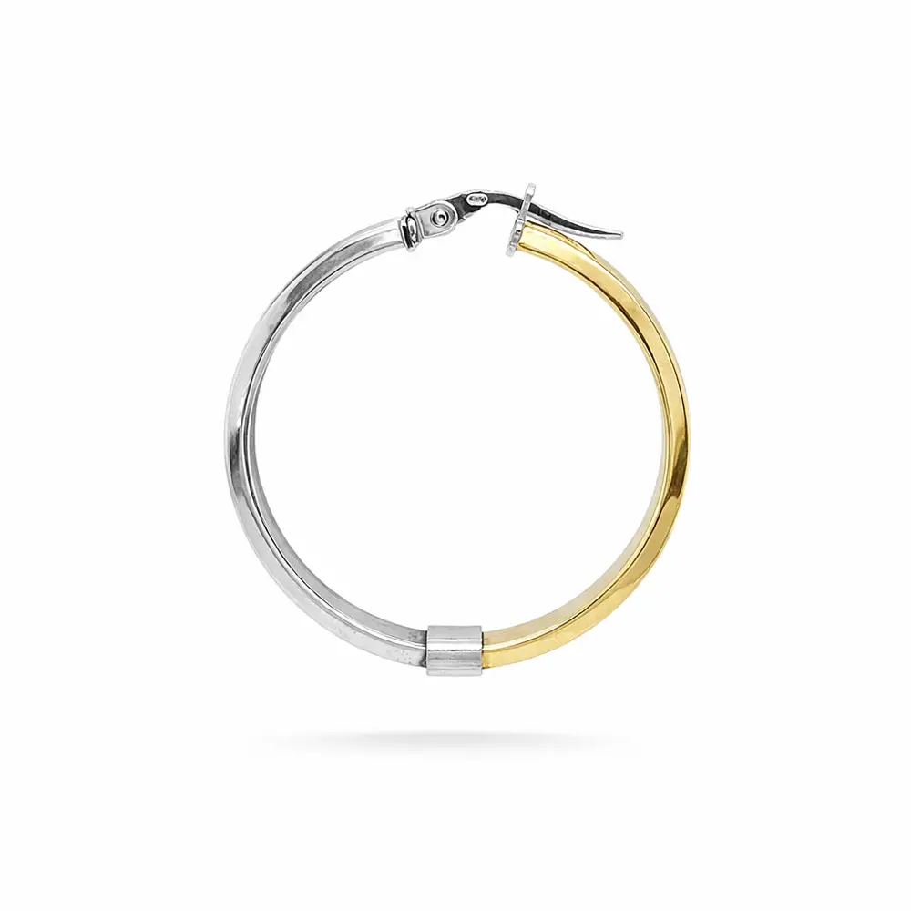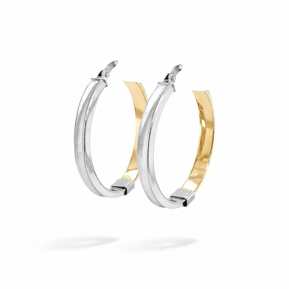 Bông tai tròn bằng vàng kết hợp nổi bật với sự kết hợp giữa bề mặt bóng và mờ, tạo nên vẻ tương phản tinh tế và phong cách hiện đại.