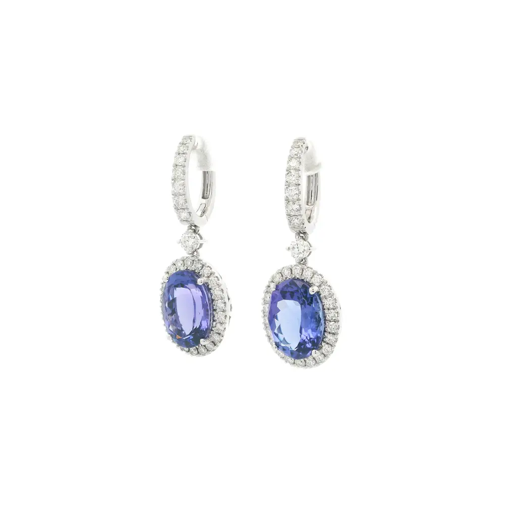Đôi bông tai vàng trắng 18K này là hiện thân của vẻ đẹp sang trọng và tinh tế. Ở trung tâm là hai viên tanzanit hình bầu dục, tỏa sáng với sắc xanh tím quyến rũ, được bao quanh bởi vòng kim cương cắt brilliant rực rỡ.