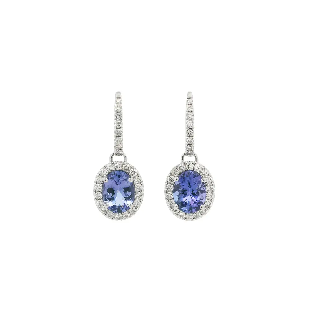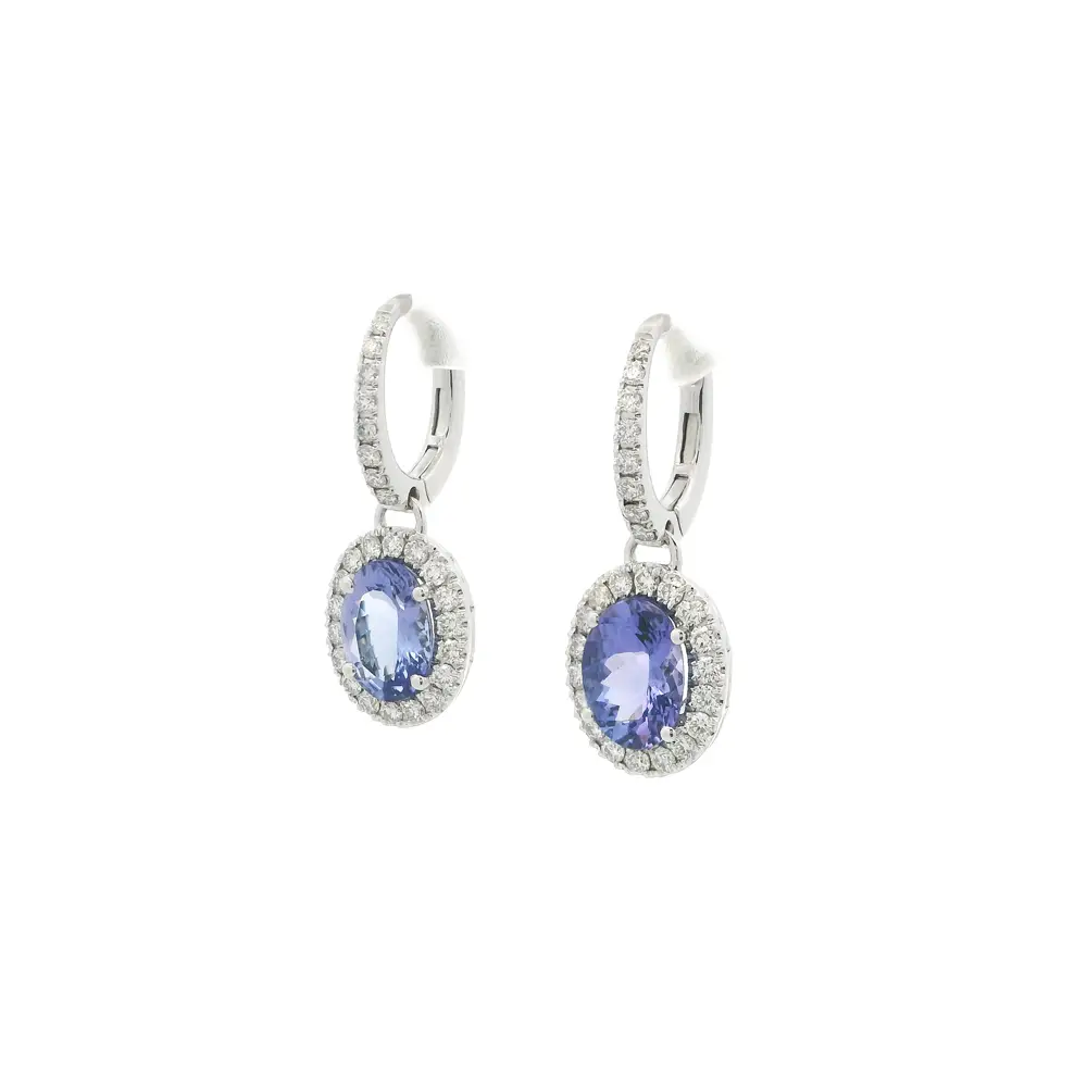 Đôi bông tai vàng trắng 18K này mang đến vẻ đẹp tinh tế và sang trọng. Ở trung tâm là hai viên tanzanit hình bầu dục, tỏa sáng với sắc xanh tím cuốn hút, được bao quanh bởi vòng kim cương trắng rực rỡ.