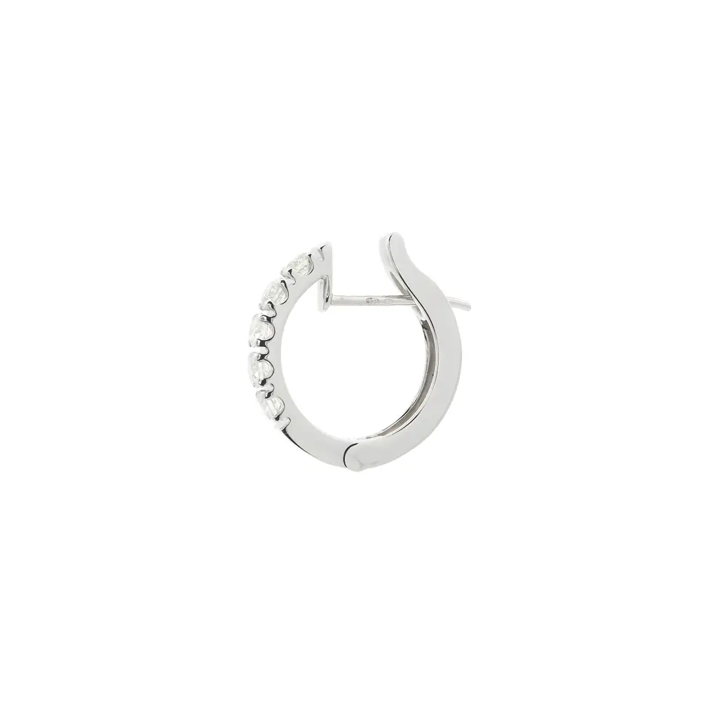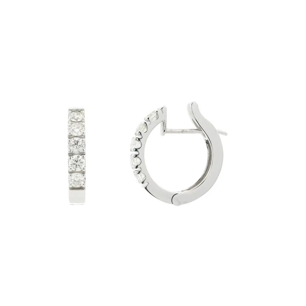 Đôi bông tai vàng trắng 18K này toát lên vẻ thanh lịch và lấp lánh quyến rũ. Thiết kế dạng vòng cổ điển được đính kim cương cắt tròn hoàn hảo, phản chiếu ánh sáng lung linh ở mọi góc nhìn.
