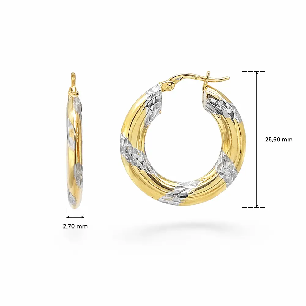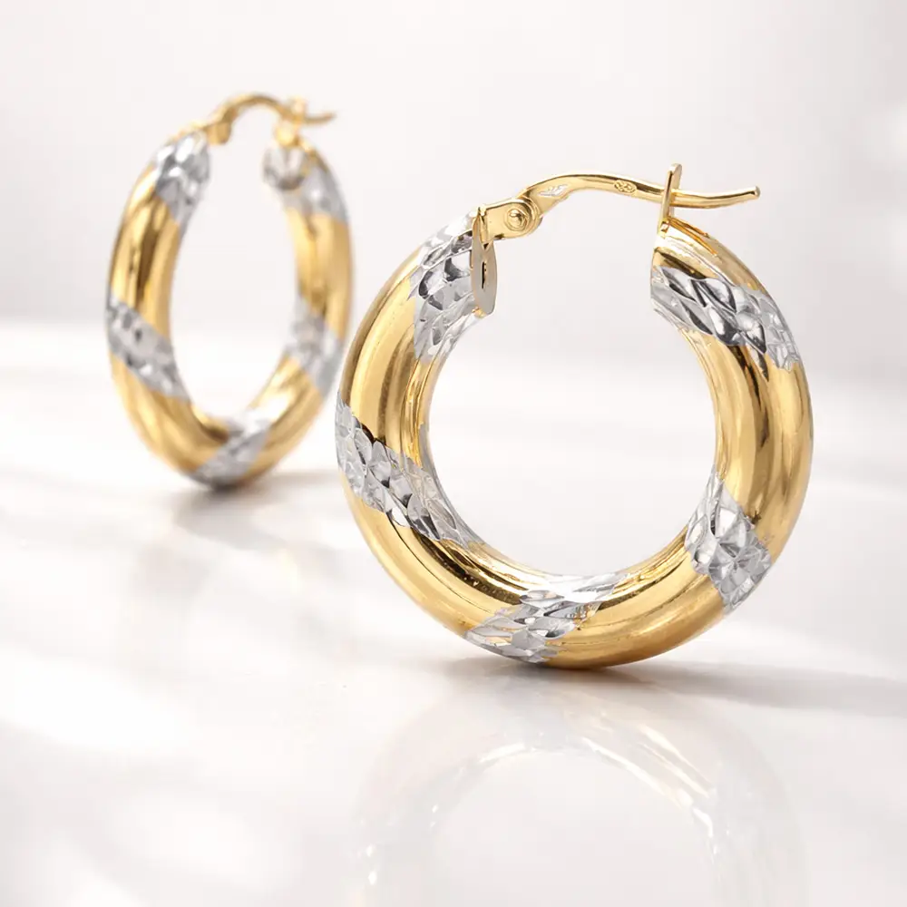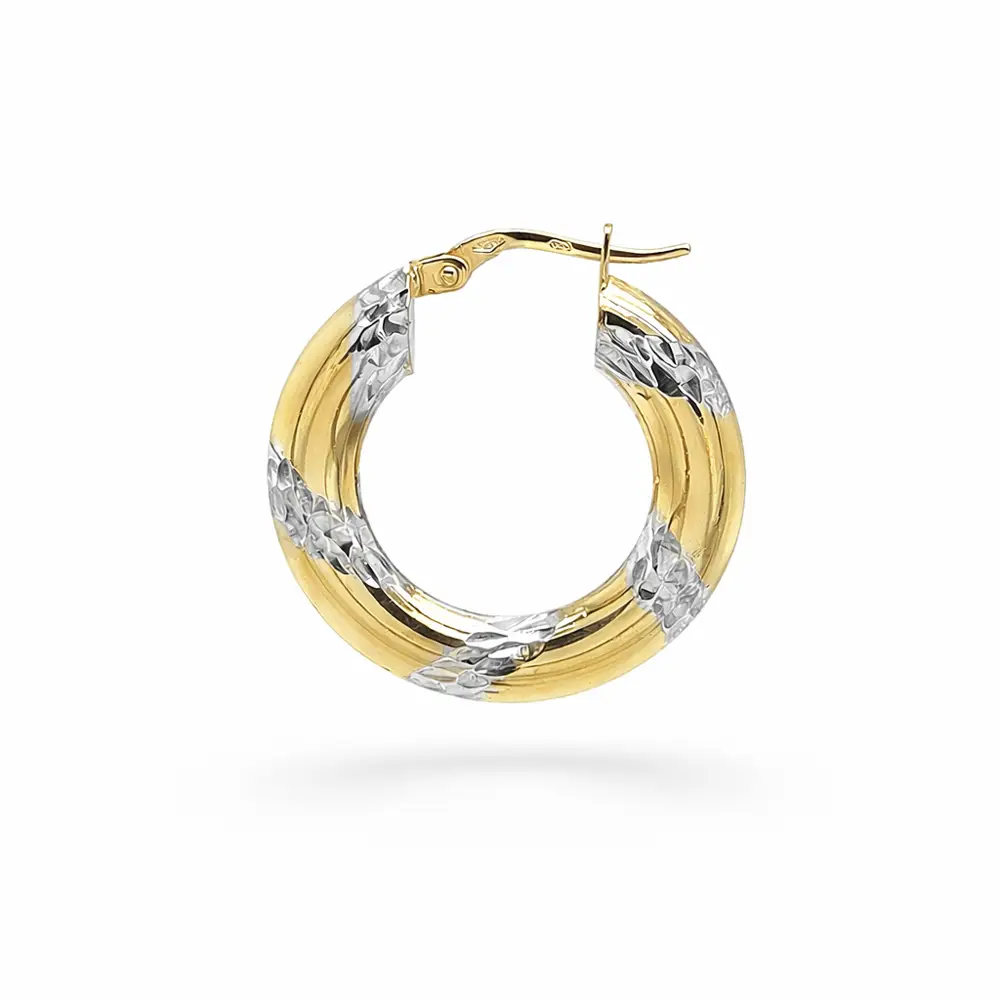 Đôi bông tai vòng bằng vàng kết hợp nổi bật với sự hòa quyện hài hòa giữa sắc vàng và trắng, được điểm xuyết bằng các chi tiết chạm khắc tinh tế. Bề mặt được chế tác tỉ mỉ tạo nên sự tương phản thanh lịch giữa các mảng nhẵn và có kết cấu, mang đến vẻ đẹp sang trọng và vượt thời gian.