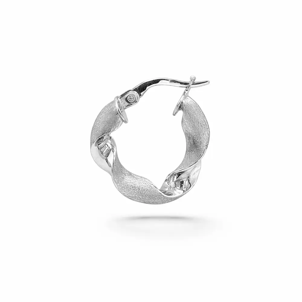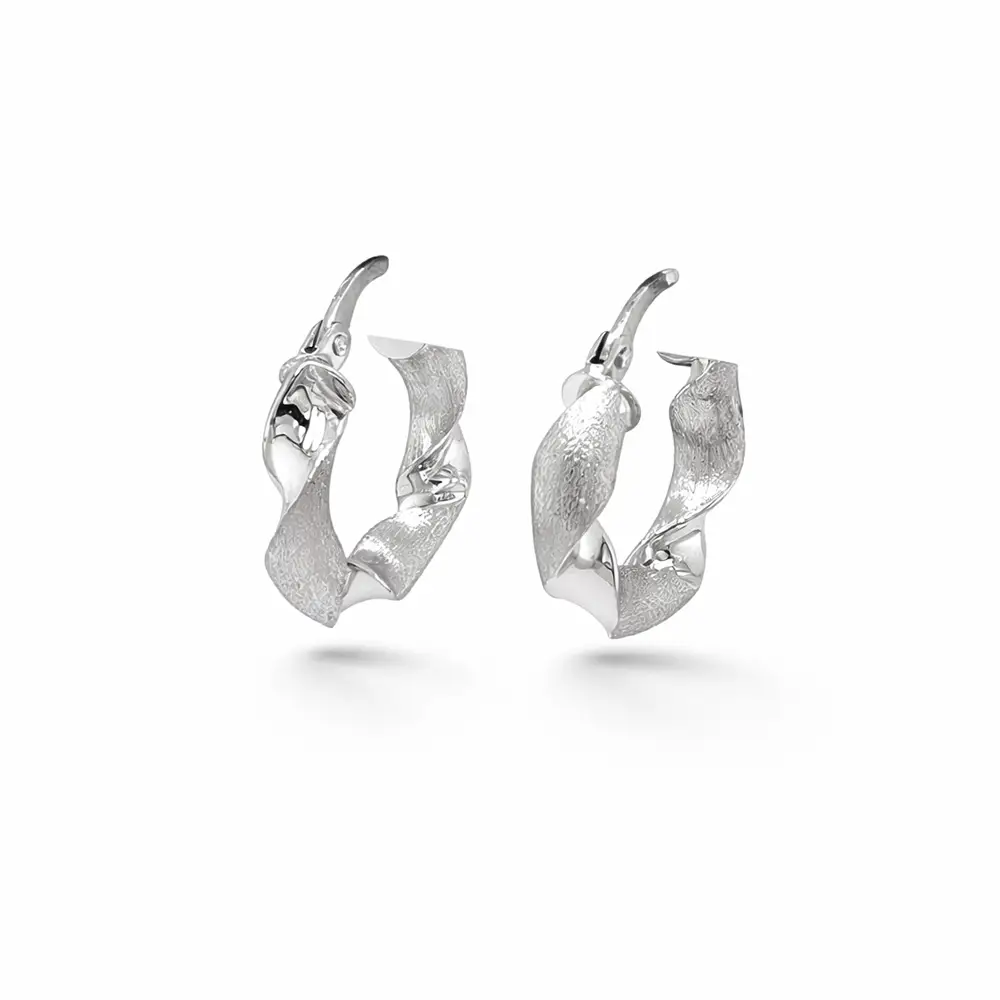 Đôi bông tai vòng bằng vàng trắng nổi bật với thiết kế xoắn thanh lịch, kết hợp hài hòa giữa bề mặt nhẵn và bề mặt có kết cấu tinh tế. Kiểu dáng uyển chuyển tạo hiệu ứng ánh sáng cuốn hút, mang đến vẻ đẹp hiện đại nhưng vẫn vượt thời gian. Tay nghề chế tác chính xác làm nổi bật giá trị sang trọng của sản phẩm.