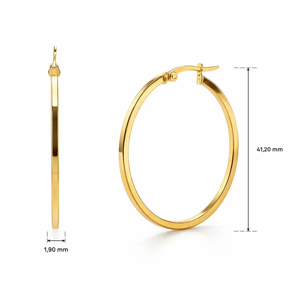 Đôi bông tai vòng bằng vàng vàng nổi bật với thiết kế trơn, tối giản, thể hiện vẻ đẹp thanh lịch vượt thời gian. Bề mặt được đánh bóng tinh tế giúp phản chiếu ánh sáng đẹp mắt và làm nổi bật sắc vàng ấm tự nhiên, mang lại vẻ ngoài trang nhã và dễ phối đồ.