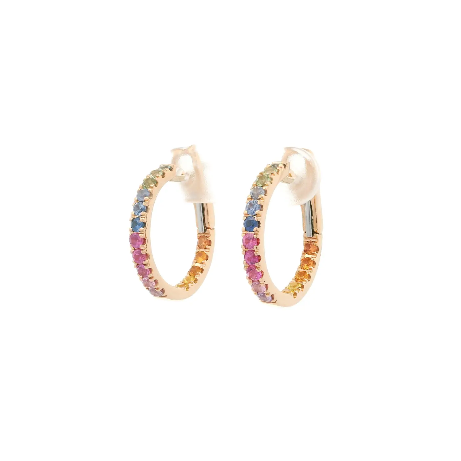 Đôi bông tai vòng vàng hồng 18K đính đá Sapphire nhiều màu là sự kết hợp hoàn hảo giữa vẻ đẹp trẻ trung và sang trọng. Mỗi viên đá Sapphire được gắn tỉ mỉ để làm nổi bật sắc màu tự nhiên – từ xanh lam, hồng, vàng đến cam – tạo nên phối sắc cầu vồng hài hòa đầy cuốn hút.