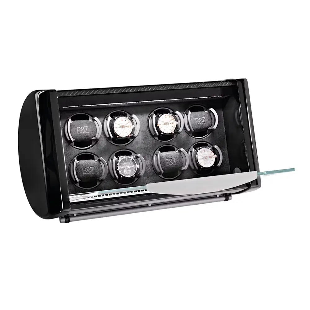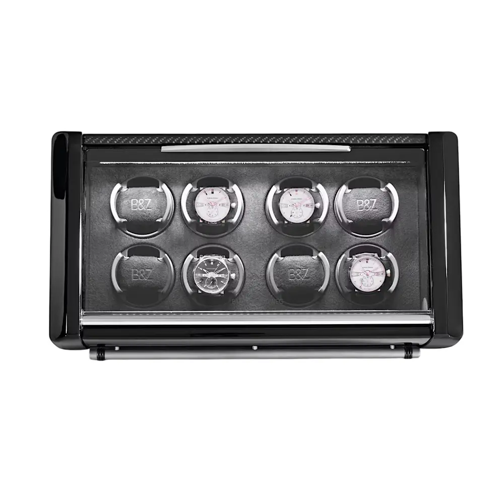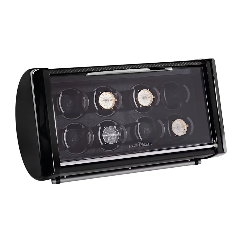 Máy lên dây đồng hồ Buben & Zorweg SPIRIT 8 là sự kết hợp hoàn hảo giữa thiết kế sang trọng, độ chính xác kỹ thuật và tay nghề thủ công tinh xảo. Sản phẩm có thể chứa đến tám chiếc đồng hồ tự động, với thân máy bằng nhôm xước cao cấp kết hợp các chi tiết tinh tế bằng carbon, da croco hoặc gỗ macassar. Mặt kính cường lực trong suốt cho phép bạn chiêm ngưỡng bộ sưu tập của mình, trong khi lớp lót nhung mềm mại bảo vệ đồng hồ khỏi trầy xước.