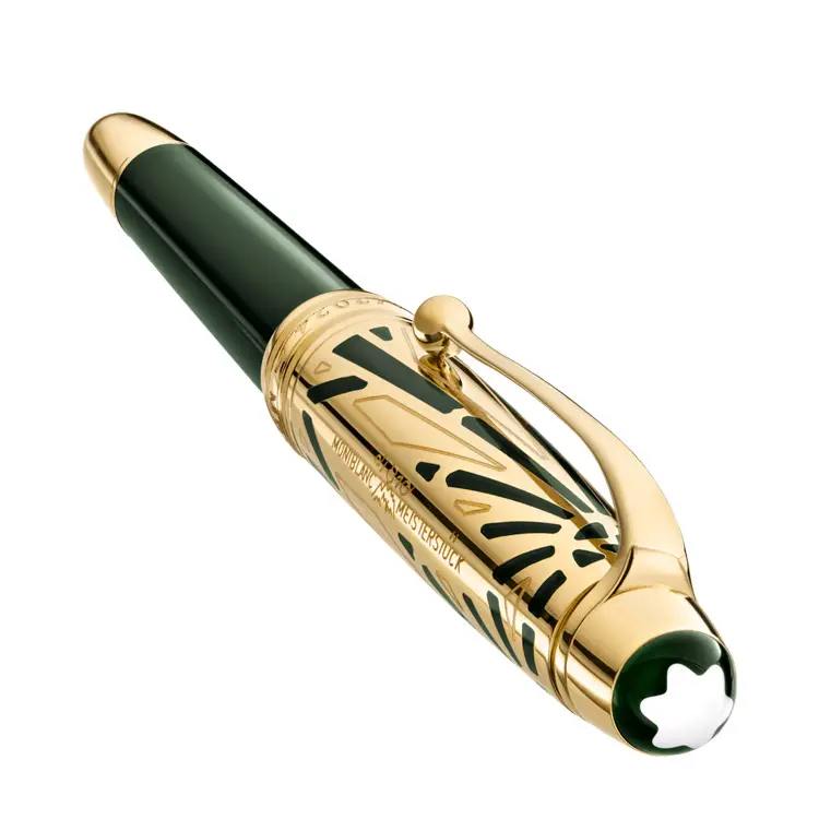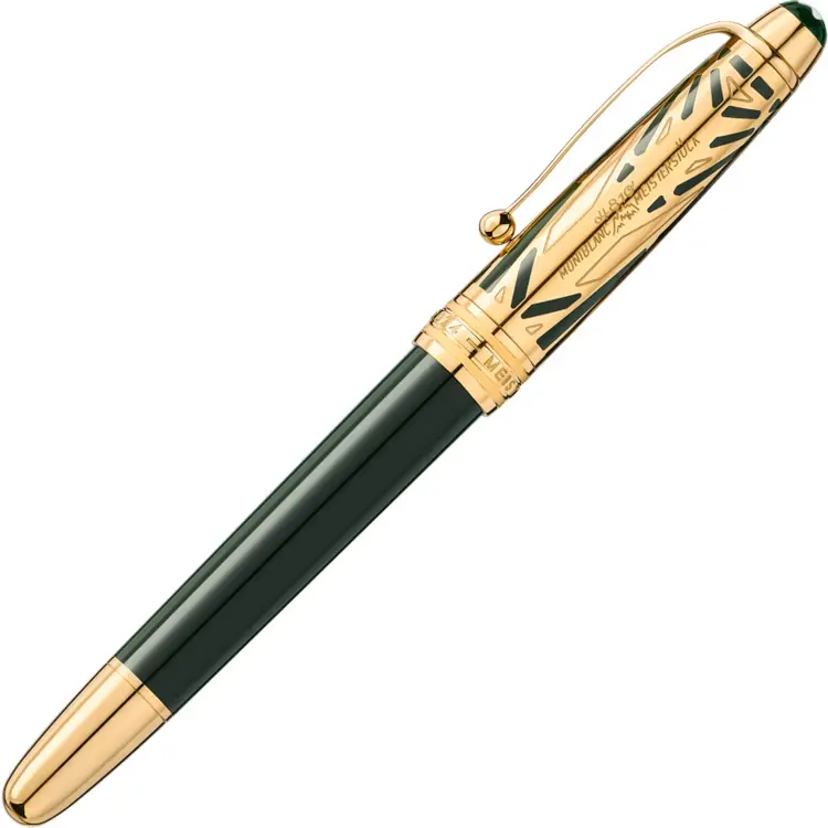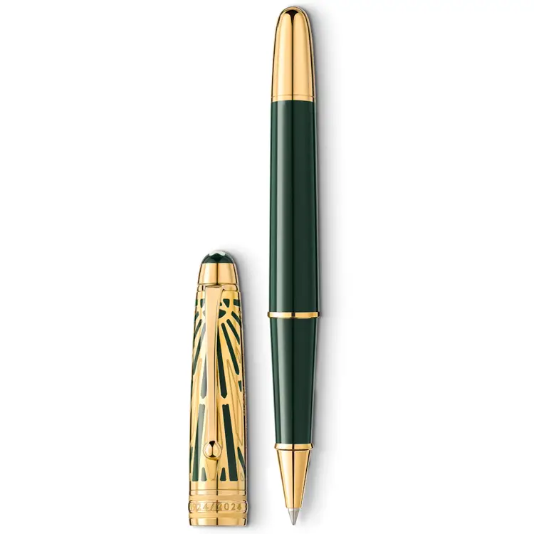 Thân bút chế tác từ nhựa quý hiếm màu xanh lá, nắp bút mạ vàng được trang trí bằng hoa văn sơn mài xanh cổ điển, tạo nên vẻ đẹp cân đối và sang trọng. Kẹp bút mạ vàng hoàn thiện tổng thể tinh tế.