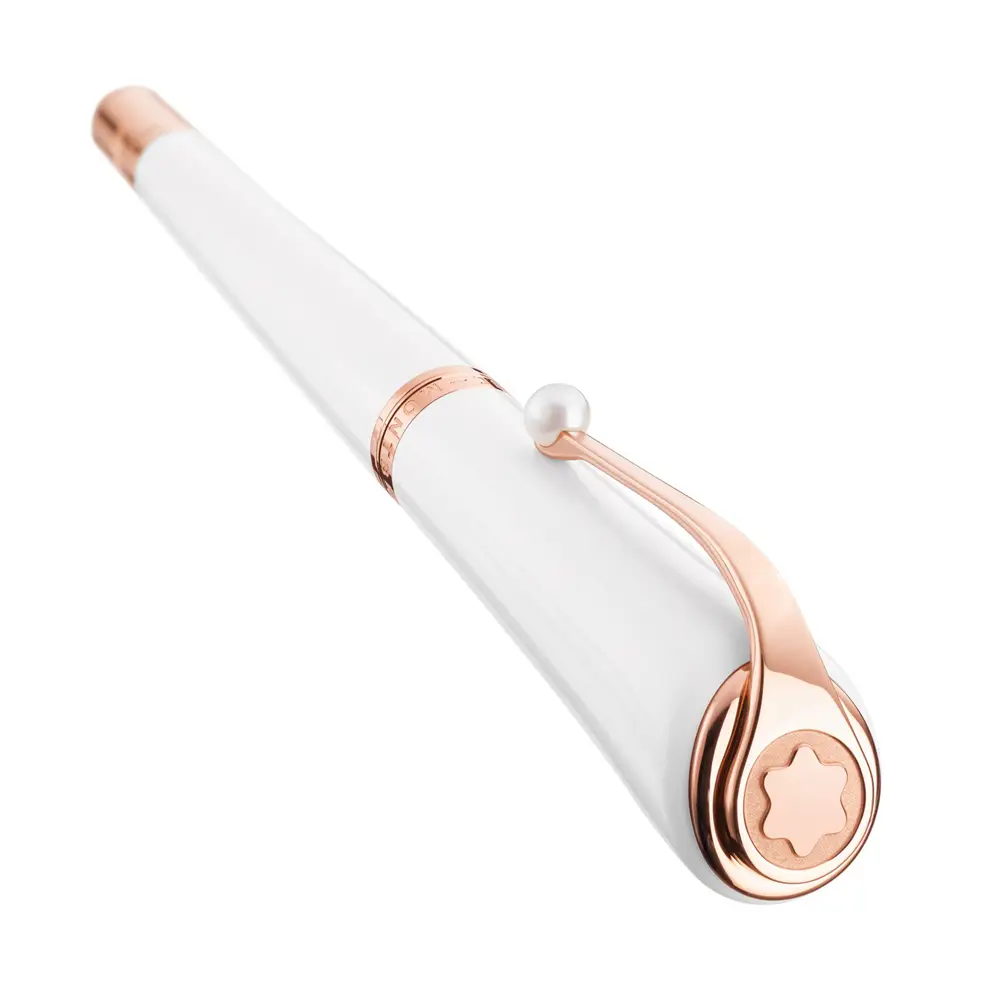 Thiết kế được hoàn thiện với kẹp bút mạ vàng hồng đính ngọc trai, tượng trưng cho niềm yêu thích trang sức ngọc trai của Marilyn Monroe. Trên đỉnh nắp bút là biểu tượng Montblanc, thể hiện sự sang trọng và chất lượng của sản phẩm. Montblanc Muses Marilyn Monroe Special Edition Pearl không chỉ là một dụng cụ viết thanh lịch mà còn là món đồ sưu tầm giá trị.