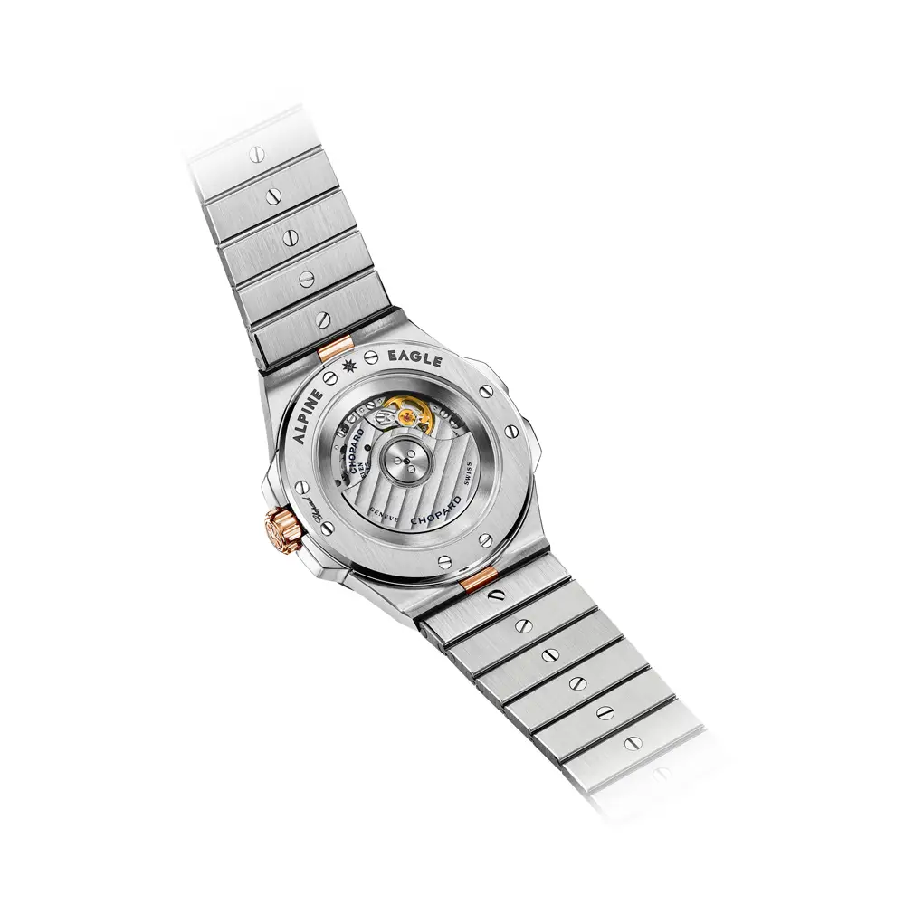 Đồng hồ Alpine Eagle kết hợp sự thể thao, sang trọng và chất liệu cao cấp. Vỏ và bộ máy được làm từ hợp kim Lucent Steel™ độc quyền, được phát triển trực tiếp bởi Chopard. Chất liệu tái chế và không gây dị ứng này nổi bật với độ sáng bóng và độ cứng tương đương vàng.