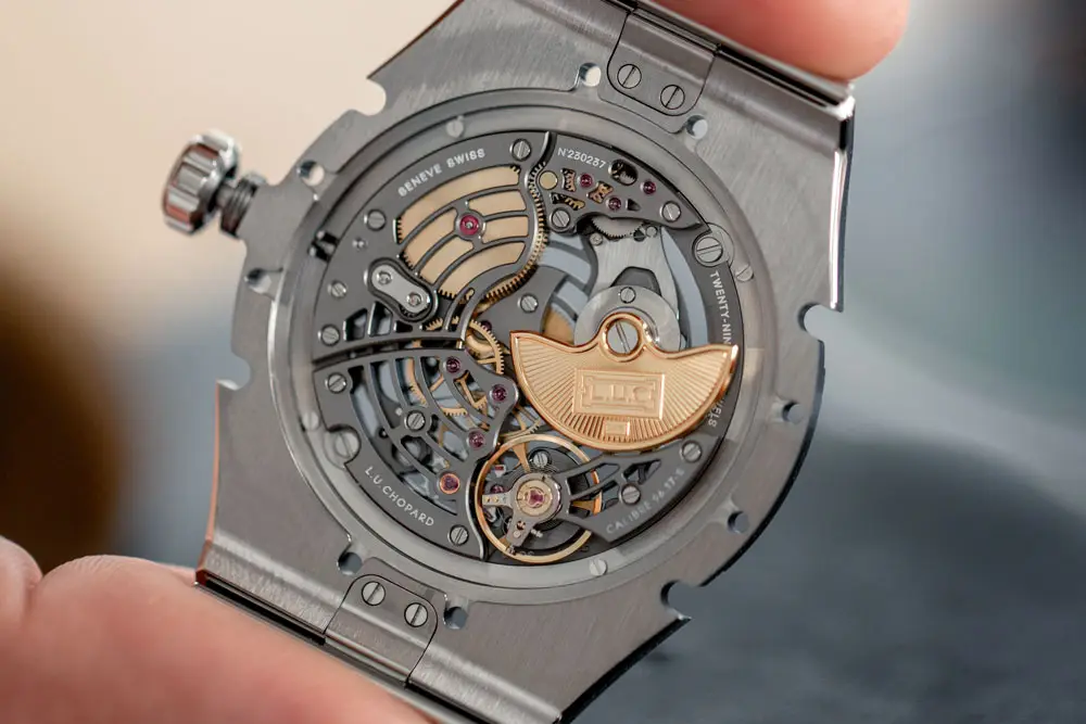 Mặt số skeleton (lộ cơ) phô bày trái tim cơ học — bộ máy tự động L.U.C 96.17-S1 với micro-rotor. Bộ máy siêu mỏng này có khả năng trữ cót 65 giờ và tần số 28.800 dao động/giờ. Nắp lưng sapphire trong suốt cho phép chiêm ngưỡng hoàn thiện tinh xảo, đặc trưng của Chopard.