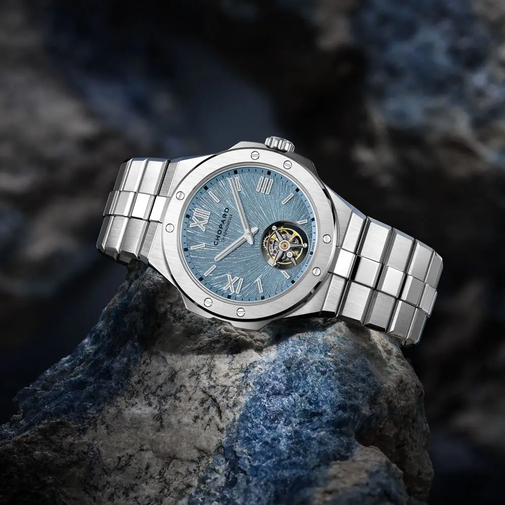 Chopard Alpine Eagle Flying Tourbillon (ref. 298616-3003) là sự kết hợp giữa chế tác đồng hồ cao cấp và phong cách thể thao hiện đại. Vỏ 41 mm được làm từ Lucent Steel™ A223, nổi bật với độ cứng và độ bóng cao. Vành bezel 8 vít đặc trưng cùng dây đeo tích hợp tạo nên thiết kế biểu tượng. Kính sapphire chống phản xạ và khả năng chống nước 100 m (10 ATM).