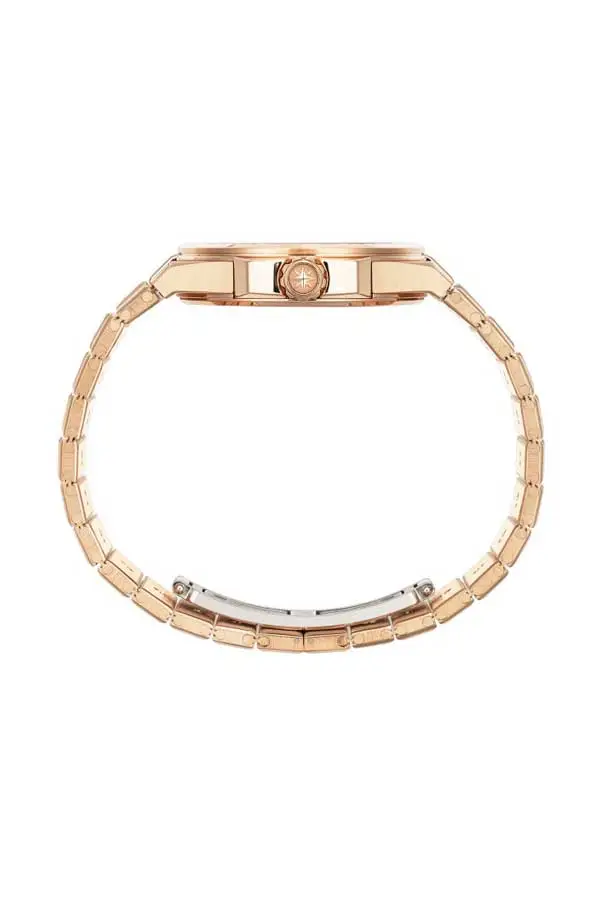 Chiếc đồng hồ hoàn chỉnh với dây đeo bằng vàng hồng 18kt và khóa gập, mang đến tổng thể hài hòa và sang trọng.