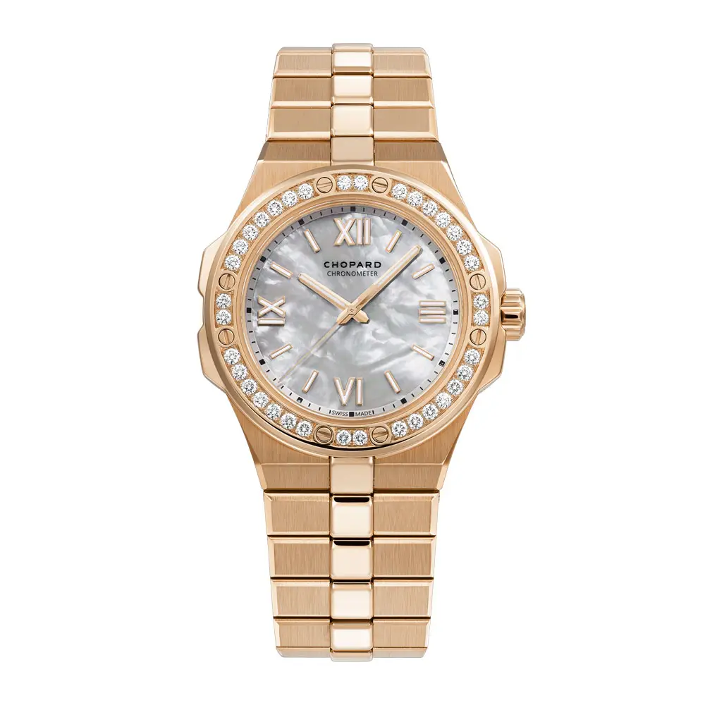 Mẫu đồng hồ Chopard Alpine Eagle Small 295370-5002 là sự hòa quyện hoàn hảo giữa sức mạnh và sự duyên dáng, lấy cảm hứng từ thiên nhiên hùng vĩ của dãy Alps. Vỏ đồng hồ đường kính 36 mm bằng vàng hồng 18kt, viền đính kim cương toát lên vẻ lộng lẫy nhưng vẫn rất tinh tế.