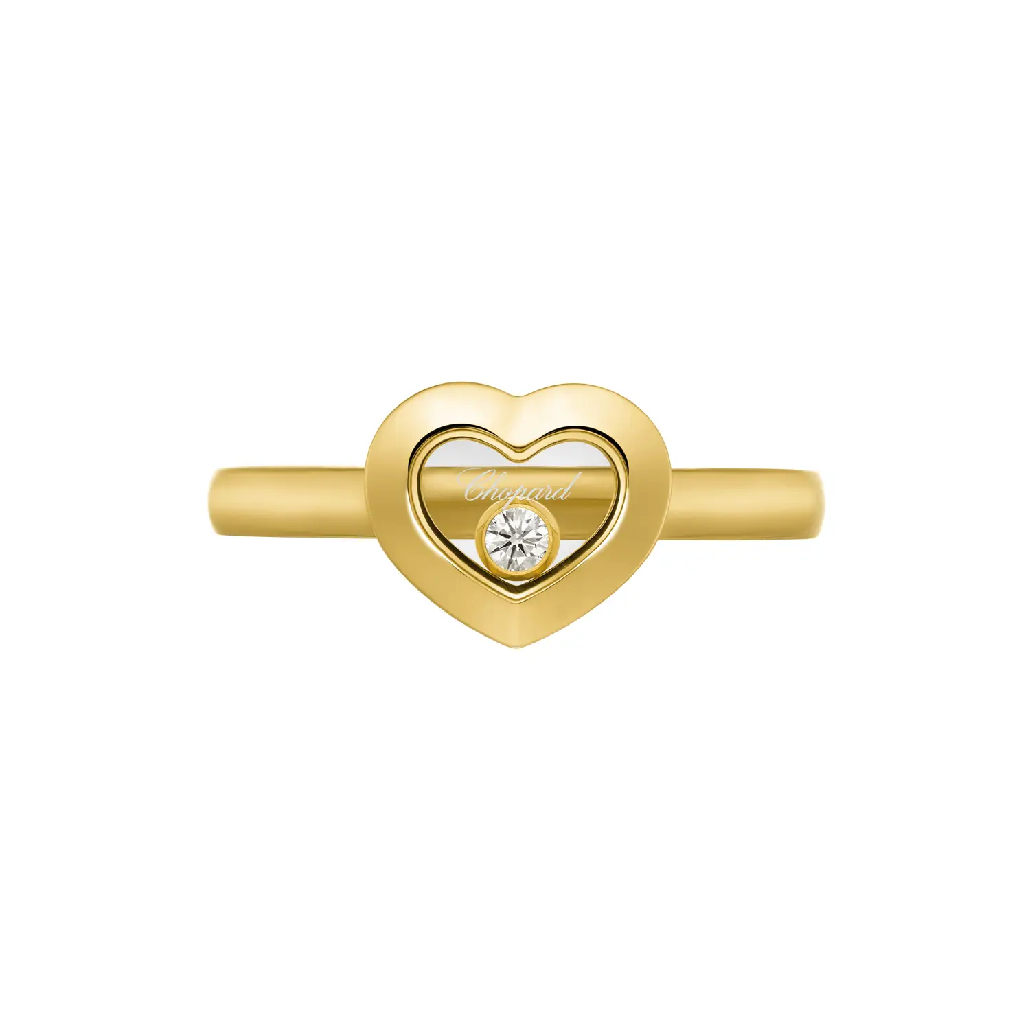 Chiếc nhẫn Chopard Happy Diamonds Icons được chế tác từ vàng vàng 18k có nguồn gốc đạo đức, toát lên vẻ nhẹ nhàng và niềm vui – đặc trưng của bộ sưu tập mang tính biểu tượng này. Ở trung tâm là viên kim cương cắt brilliant khoảng 0,05 ct, tự do chuyển động giữa hai lớp kính sapphire, bắt sáng theo từng cử động để tạo hiệu ứng lấp lánh sống động. Thiết kế tối giản với đường cong mềm mại tôn lên vẻ nữ tính và thanh lịch vượt thời gian.